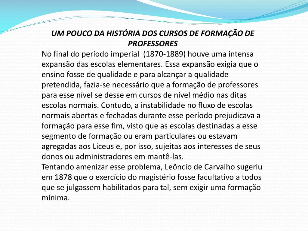 UM POUCO DA HISTÓRIA DOS CURSOS DE FORMAÇÃO DE PROFESSORES No final do período imperial (1870-1889) houve uma intensa expansão das escolas elementares. Essa expansão exigia que o ensino fosse de qualidade e para alcançar a qualidade pretendida, fazia-se necessário que a formação de professores para esse nível se desse em cursos de nível médio nas ditas escolas normais. Contudo, a instabilidade no fluxo de escolas normais abertas e fechadas durante esse período prejudicava a formação para esse fim, visto que as escolas destinadas a esse segmento de formação ou eram particulares ou estavam agregadas aos Liceus e, por isso, sujeitas aos interesses de seus donos ou administradores em mantê-las. Tentando amenizar esse problema, Leôncio de Carvalho sugeriu em 1878 que o exercício do magistério fosse facultativo a todos que se julgassem habilitados para tal, sem exigir uma formação mínima.