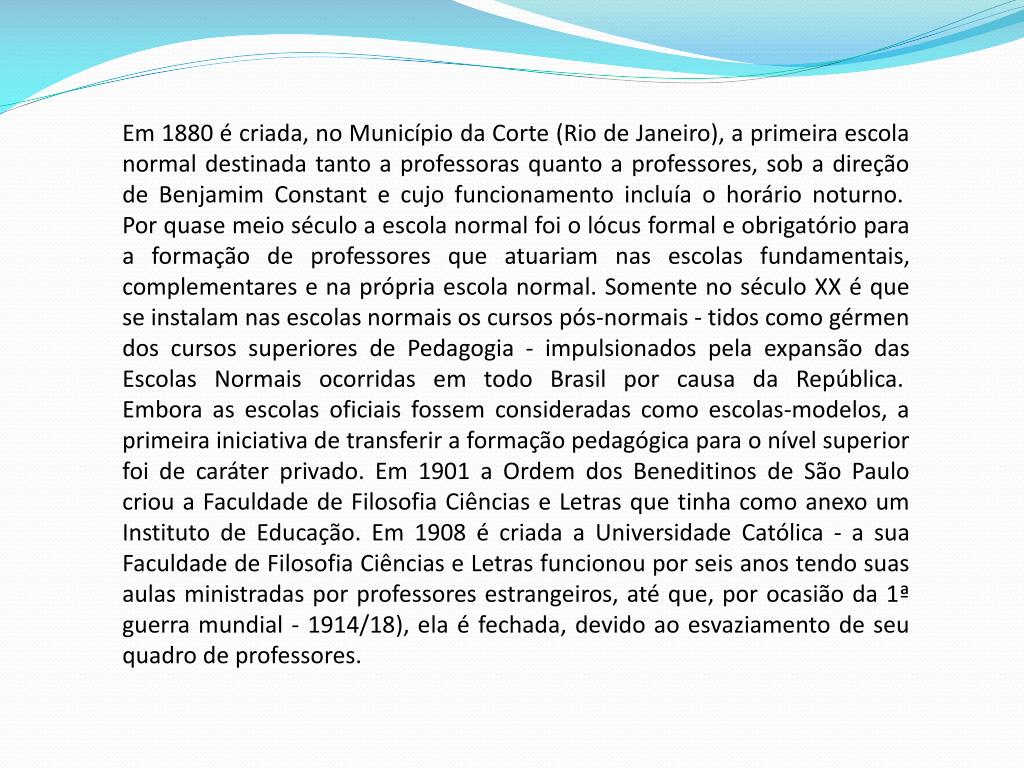 Em 1880 é criada, no Município da Corte (Rio de Janeiro), a primeira escola normal destinada tanto a professoras quanto a professores, sob a direção de Benjamim Constant e cujo funcionamento incluía o horário noturno. Por quase meio século a escola normal foi o lócus formal e obrigatório para a formação de professores que atuariam nas escolas fundamentais, complementares e na própria escola normal. Somente no século XX é que se instalam nas escolas normais os cursos pós-normais - tidos como gérmen dos cursos superiores de Pedagogia - impulsionados pela expansão das Escolas Normais ocorridas em todo Brasil por causa da República. Embora as escolas oficiais fossem consideradas como escolas-modelos, a primeira iniciativa de transferir a formação pedagógica para o nível superior foi de caráter privado. Em 1901 a Ordem dos Beneditinos de São Paulo criou a Faculdade de Filosofia Ciências e Letras que tinha como anexo um Instituto de Educação. Em 1908 é criada a Universidade Católica - a sua Faculdade de Filosofia Ciências e Letras funcionou por seis anos tendo suas aulas ministradas por professores estrangeiros, até que, por ocasião da 1ª guerra mundial - 1914/18), ela é fechada, devido ao esvaziamento de seu quadro de professores.