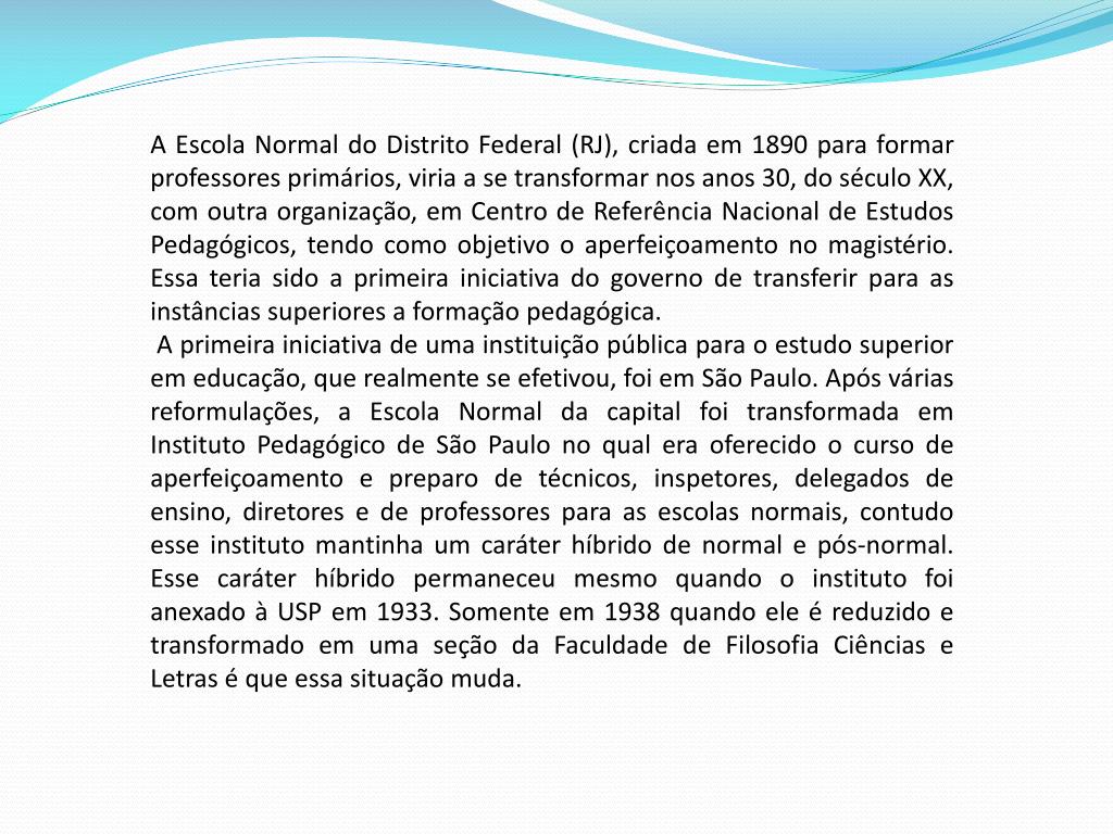 A Escola Normal do Distrito Federal (RJ), criada em 1890 para formar professores primários, viria a se transformar nos anos 30, do século XX, com outra organização, em Centro de Referência Nacional de Estudos Pedagógicos, tendo como objetivo o aperfeiçoamento no magistério. Essa teria sido a primeira iniciativa do governo de transferir para as instâncias superiores a formação pedagógica. A primeira iniciativa de uma instituição pública para o estudo superior em educação, que realmente se efetivou, foi em São Paulo. Após várias reformulações, a Escola Normal da capital foi transformada em Instituto Pedagógico de São Paulo no qual era oferecido o curso de aperfeiçoamento e preparo de técnicos, inspetores, delegados de ensino, diretores e de professores para as escolas normais, contudo esse instituto mantinha um caráter híbrido de normal e pós-normal. Esse caráter híbrido permaneceu mesmo quando o instituto foi anexado à USP em 1933. Somente em 1938 quando ele é reduzido e transformado em uma seção da Faculdade de Filosofia Ciências e Letras é que essa situação muda.