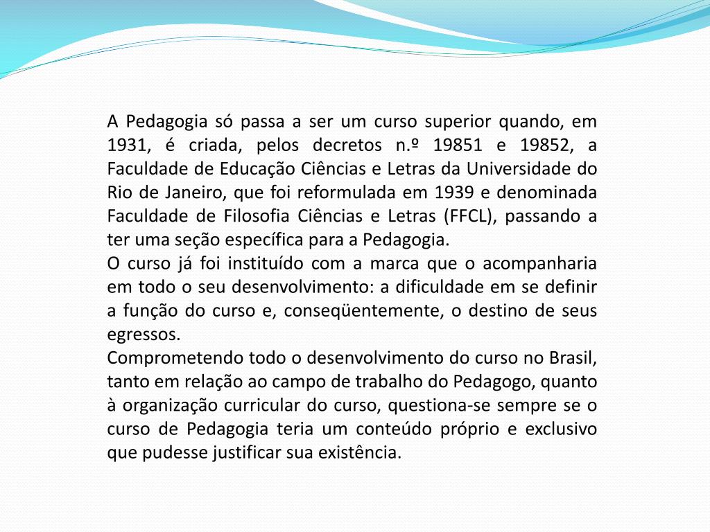 A Pedagogia só passa a ser um curso superior quando, em 1931, é criada, pelos decretos n.º 19851 e 19852, a Faculdade de Educação Ciências e Letras da Universidade do Rio de Janeiro, que foi reformulada em 1939 e denominada Faculdade de Filosofia Ciências e Letras (FFCL), passando a ter uma seção específica para a Pedagogia. O curso já foi instituído com a marca que o acompanharia em todo o seu desenvolvimento: a dificuldade em se definir a função do curso e, conseqüentemente, o destino de seus egressos. Comprometendo todo o desenvolvimento do curso no Brasil, tanto em relação ao campo de trabalho do Pedagogo, quanto à organização curricular do curso, questiona-se sempre se o curso de Pedagogia teria um conteúdo próprio e exclusivo que pudesse justificar sua existência.