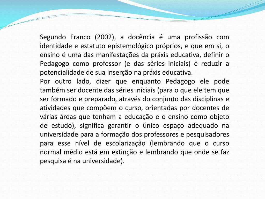 Segundo Franco (2002), a docência é uma profissão com identidade e estatuto epistemológico próprios, e que em si, o ensino é uma das manifestações da práxis educativa, definir o Pedagogo como professor (e das séries iniciais) é reduzir a potencialidade de sua inserção na práxis educativa. Por outro lado, dizer que enquanto Pedagogo ele pode também ser docente das séries iniciais (para o que ele tem que ser formado e preparado, através do conjunto das disciplinas e atividades que compõem o curso, orientadas por docentes de várias áreas que tenham a educação e o ensino como objeto de estudo), significa garantir o único espaço adequado na universidade para a formação dos professores e pesquisadores para esse nível de escolarização (lembrando que o curso normal médio está em extinção e lembrando que onde se faz pesquisa é na universidade).