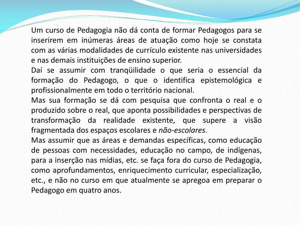 Um curso de Pedagogia não dá conta de formar Pedagogos para se inserirem em inúmeras áreas de atuação como hoje se constata com as várias modalidades de currículo existente nas universidades e nas demais instituições de ensino superior. Daí se assumir com tranqüilidade o que seria o essencial da formação do Pedagogo, o que o identifica epistemológica e profissionalmente em todo o território nacional. Mas sua formação se dá com pesquisa que confronta o real e o produzido sobre o real, que aponta possibilidades e perspectivas de transformação da realidade existente, que supere a visão fragmentada dos espaços escolares e não-escolares. Mas assumir que as áreas e demandas específicas, como educação de pessoas com necessidades, educação no campo, de indígenas, para a inserção nas mídias, etc. se faça fora do curso de Pedagogia, como aprofundamentos, enriquecimento curricular, especialização, etc., e não no curso em que atualmente se apregoa em preparar o Pedagogo em quatro anos.