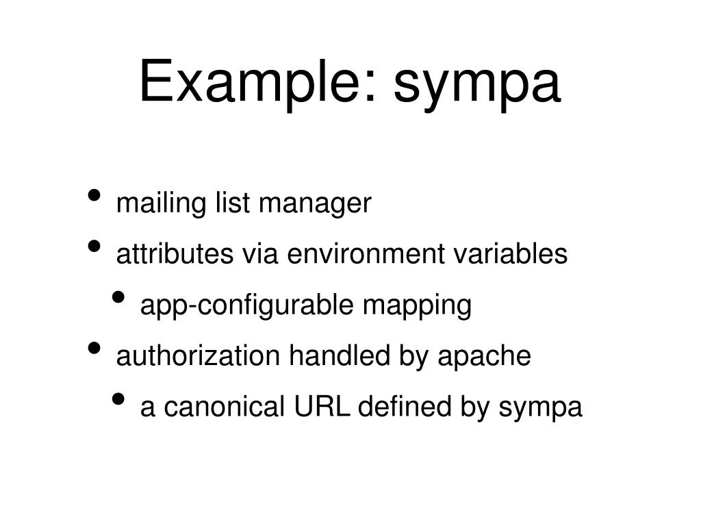 Example: sympa • mailing list manager • attributes via environment variables • app-configurable mapping • authorization handled by apache • a canonical URL defined by sympa