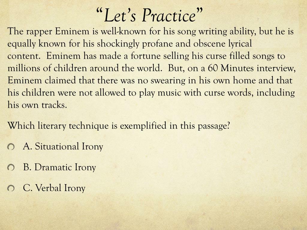 “Let’s Practice” The rapper Eminem is well-known for his song writing ability, but he is equally known for his shockingly profane and obscene lyrical content. Eminem has made a fortune selling his curse filled songs to millions of children around the world. But, on a 60 Minutes interview, Eminem claimed that there was no swearing in his own home and that his children were not allowed to play music with curse words, including his own tracks. Which literary technique is exemplified in this passage? • A. Situational Irony • B. Dramatic Irony • C. Verbal Irony