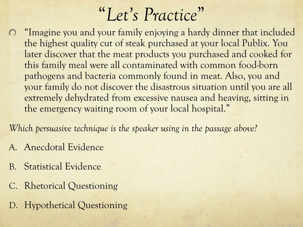 “Let’s Practice” • “Imagine you and your family enjoying a hardy dinner that included the highest quality cut of steak purchased at your local Publix. You later discover that the meat products you purchased and cooked for this family meal were all contaminated with common food-born pathogens and bacteria commonly found in meat. Also, you and your family do not discover the disastrous situation until you are all extremely dehydrated from excessive nausea and heaving, sitting in the emergency waiting room of your local hospital.” Which persuasive technique is the speaker using in the passage above? • Anecdotal Evidence • Statistical Evidence • Rhetorical Questioning • Hypothetical Questioning