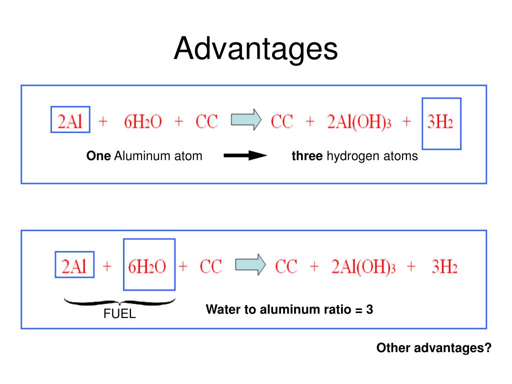 Advantages One Aluminum atom three hydrogen atoms Water to aluminum ratio = 3 FUEL Other advantages?