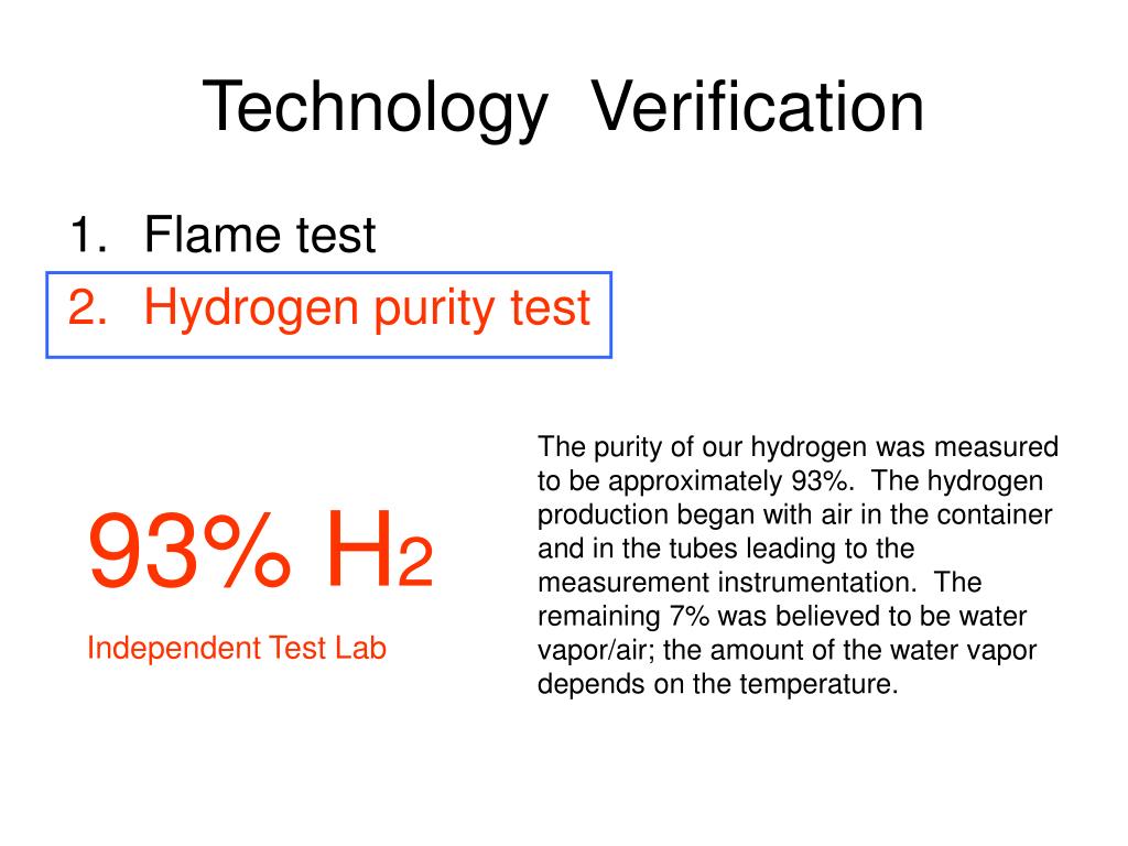 Technology Verification • Flame test • Hydrogen purity test • Flow rate measurements Hydrogen at 1 LPM to 20 LPM Simple, easy, cheap