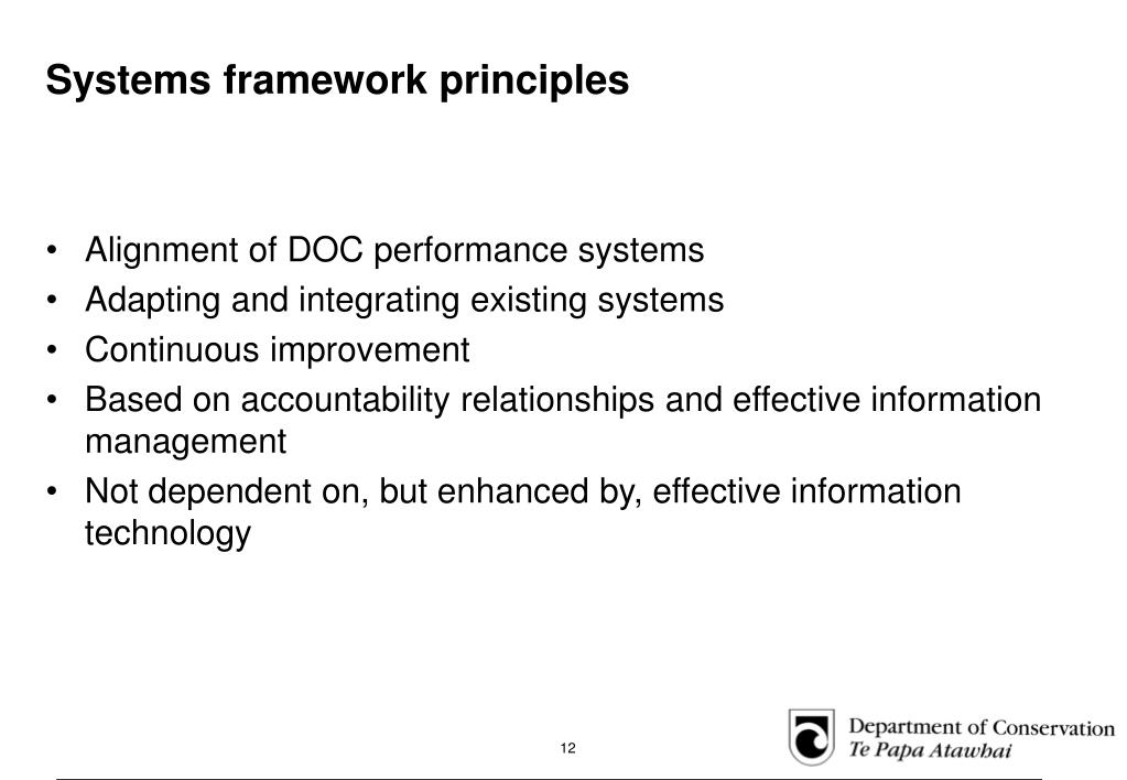General Principles System should reinforce: • information required to manage the business • the organisational model and working at role • leadership and modelling at every level, led from the top • trust, integrity, and openness • accountability for the purpose of improvement rather than blame • alignment and adaptation of existing DOC performance systems • use of guidelines and standards • the required shift in mind-set and behaviours: