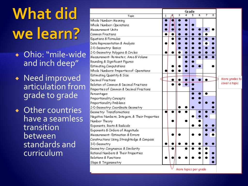 What did we learn? • Ohio: “mile-wide and inch deep” • Need improved articulation from grade to grade • Other countries have a seamless transition between standards and curriculum