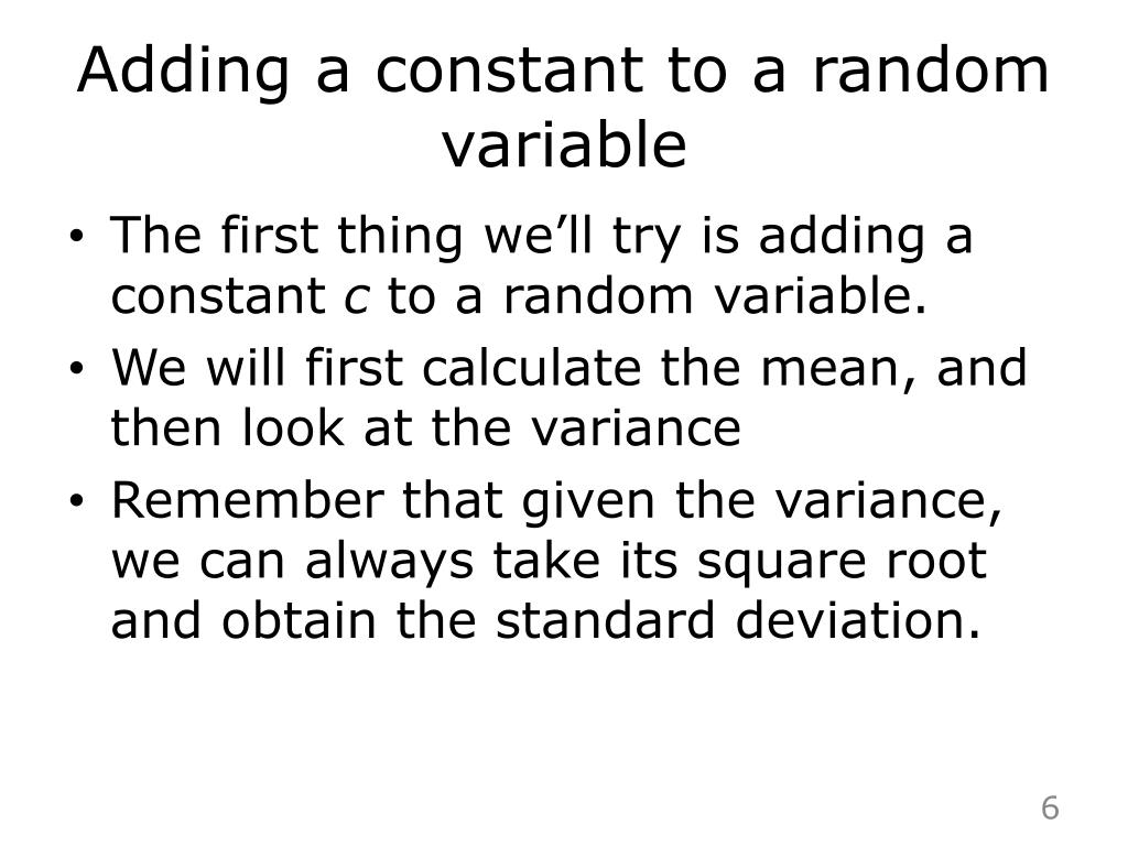Adding a constant to a random variable • The first thing we’ll try is adding a constant c to a random variable. • We will first calculate the mean, and then look at the variance • Remember that given the variance, we can always take its square root and obtain the standard deviation.