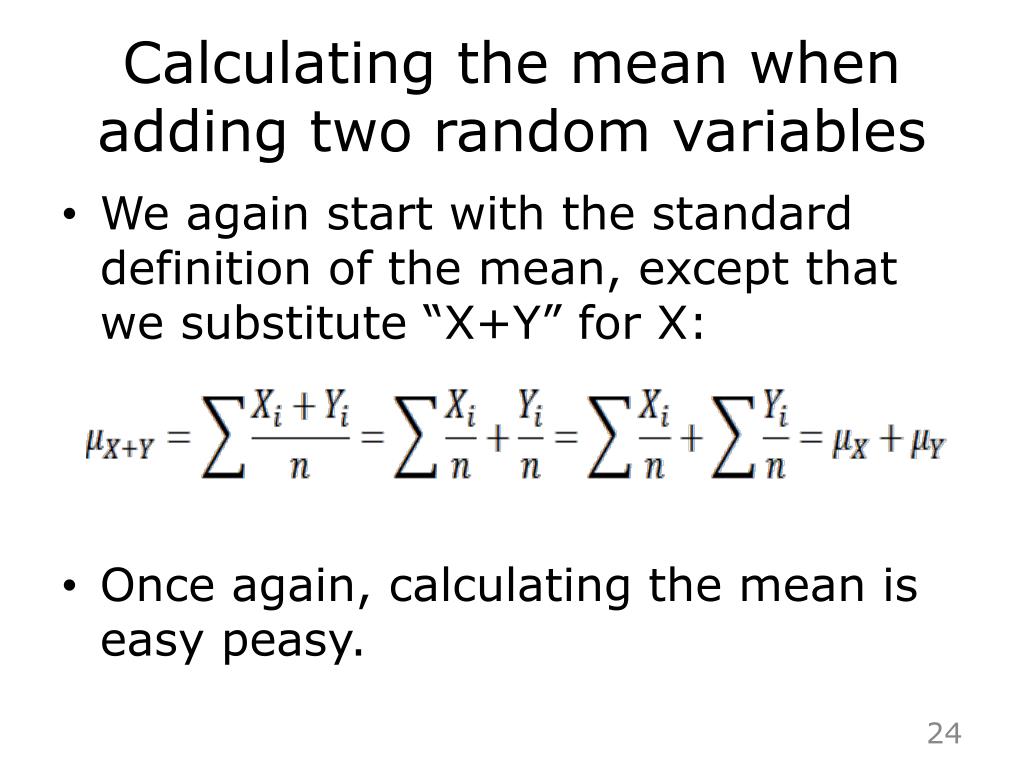 Calculating the mean when adding two random variables • We again start with the standard definition of the mean, except that we substitute “X+Y” for X: • Once again, calculating the mean is easy peasy.