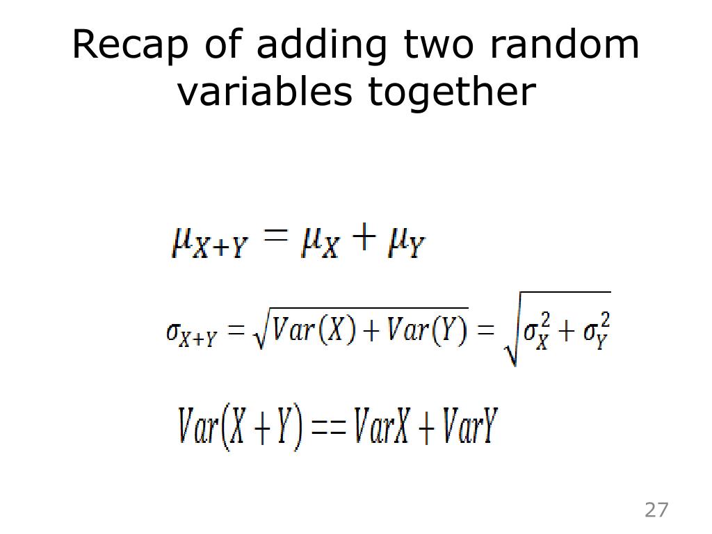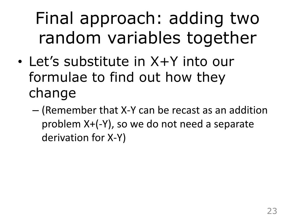 Final approach: adding two random variables together • Let’s substitute in X+Y into our formulae to find out how they change • (Remember that X-Y can be recast as an addition problem X+(-Y), so we do not need a separate derivation for X-Y)