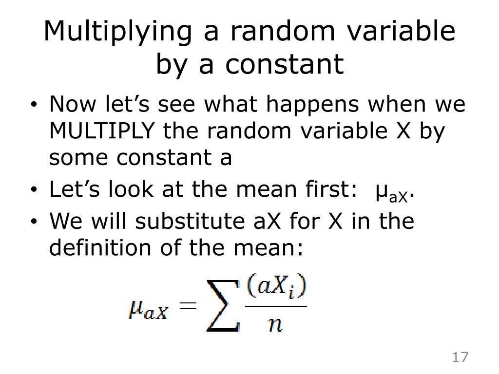 Multiplying a random variable by a constant • Now let’s see what happens when we MULTIPLY the random variable X by some constant a • Let’s look at the mean first: μaX. • We will substitute aX for X in the definition of the mean: