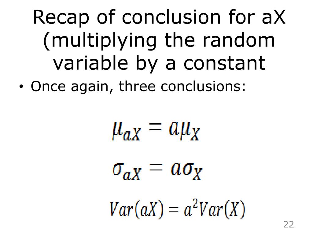 Recap of conclusion for aX (multiplying the random variable by a constant • Once again, three conclusions: