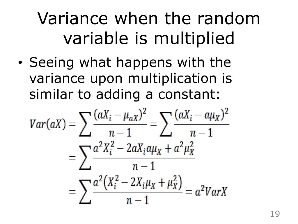 Variance when the random variable is multiplied • Seeing what happens with the variance upon multiplication is similar to adding a constant: