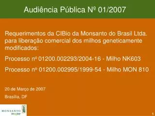 Audiência Pública Nº 01/2007. Requerimentos da CIBio da Monsanto do Brasil Ltda. para liberação comercial dos milhos geneticamente modificados: Processo n o 01200.002293/2004-16 - Milho NK603 Processo n o 01200.002995/1999-54 - Milho MON 810 20 de Março de 2007 Brasília, DF.