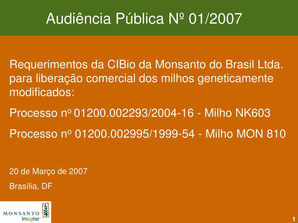 Audiência Pública Nº 01/2007 Requerimentos da CIBio da Monsanto do Brasil Ltda. para liberação comercial dos milhos geneticamente modificados: Processo no 01200.002293/2004-16 - Milho NK603 Processo no 01200.002995/1999-54 - Milho MON 810 20 de Março de 2007 Brasília, DF