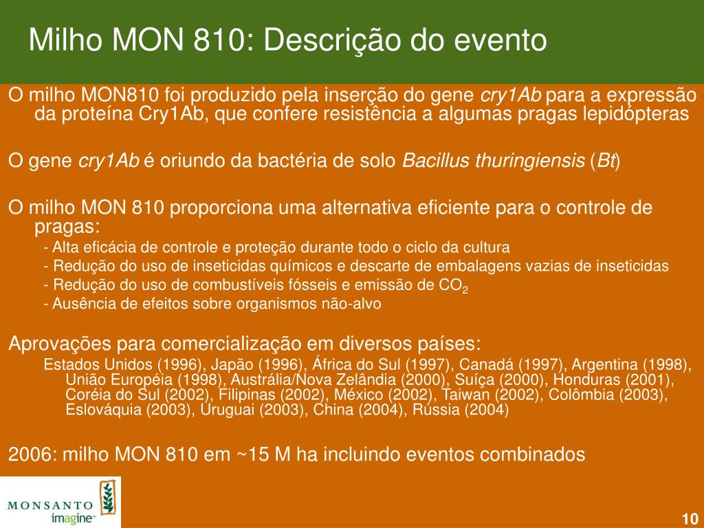 O milho MON810 foi produzido pela inserção do gene cry1Ab para a expressão da proteína Cry1Ab, que confere resistência a algumas pragas lepidópteras O gene cry1Ab é oriundo da bactéria de solo Bacillus thuringiensis (Bt) O milho MON 810 proporciona uma alternativa eficiente para o controle de pragas: - Alta eficácia de controle e proteção durante todo o ciclo da cultura - Redução do uso de inseticidas químicos e descarte de embalagens vazias de inseticidas - Redução do uso de combustíveis fósseis e emissão de CO2 - Ausência de efeitos sobre organismos não-alvo Aprovações para comercialização em diversos países: Estados Unidos (1996), Japão (1996), África do Sul (1997), Canadá (1997), Argentina (1998), União Européia (1998), Austrália/Nova Zelândia (2000), Suíça (2000), Honduras (2001), Coréia do Sul (2002), Filipinas (2002), México (2002), Taiwan (2002), Colômbia (2003), Eslováquia (2003), Uruguai (2003), China (2004), Rússia (2004) 2006: milho MON 810 em ~15 M ha incluindo eventos combinados Milho MON 810: Descrição do evento