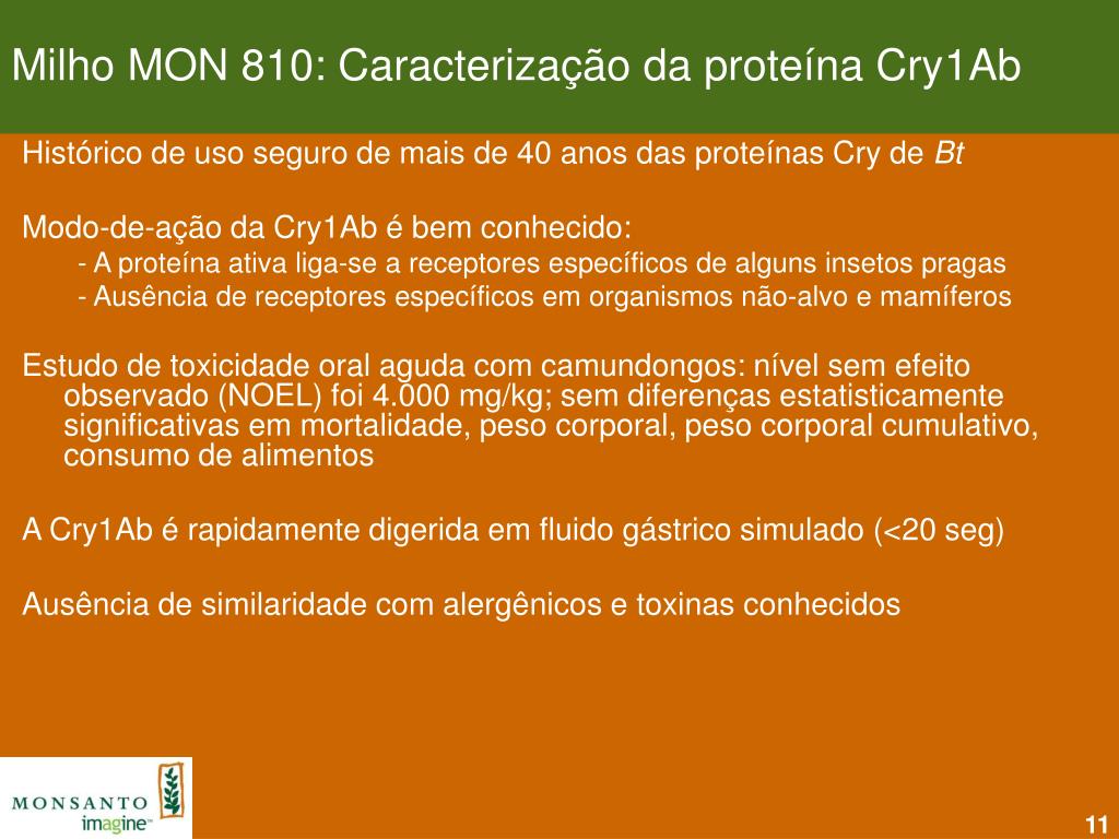 Histórico de uso seguro de mais de 40 anos das proteínas Cry de Bt Modo-de-ação da Cry1Ab é bem conhecido: - A proteína ativa liga-se a receptores específicos de alguns insetos pragas - Ausência de receptores específicos em organismos não-alvo e mamíferos Estudo de toxicidade oral aguda com camundongos: nível sem efeito observado (NOEL) foi 4.000 mg/kg; sem diferenças estatisticamente significativas em mortalidade, peso corporal, peso corporal cumulativo, consumo de alimentos A Cry1Ab é rapidamente digerida em fluido gástrico simulado (<20 seg) Ausência de similaridade com alergênicos e toxinas conhecidos Milho MON 810: Caracterização da proteína Cry1Ab