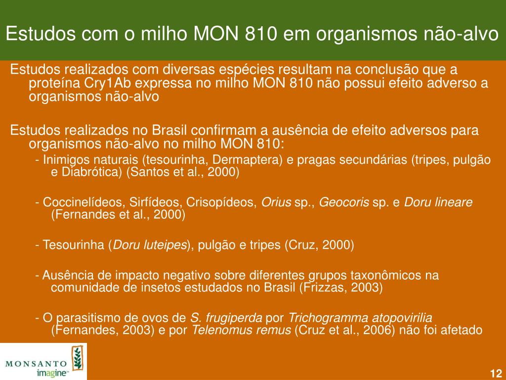 Estudos realizados com diversas espécies resultam na conclusão que a proteína Cry1Ab expressa no milho MON 810 não possui efeito adverso a organismos não-alvo Estudos realizados no Brasil confirmam a ausência de efeito adversos para organismos não-alvo no milho MON 810: - Inimigos naturais (tesourinha, Dermaptera) e pragas secundárias (tripes, pulgão e Diabrótica) (Santos et al., 2000) - Coccinelídeos, Sirfídeos, Crisopídeos, Orius sp., Geocoris sp. e Doru lineare (Fernandes et al., 2000) - Tesourinha (Doru luteipes), pulgão e tripes (Cruz, 2000) - Ausência de impacto negativo sobre diferentes grupos taxonômicos na comunidade de insetos estudados no Brasil (Frizzas, 2003) - O parasitismo de ovos de S. frugiperda por Trichogramma atopovirilia(Fernandes, 2003) e porTelenomus remus (Cruz et al., 2006) não foi afetado Estudos com o milho MON 810 em organismos não-alvo
