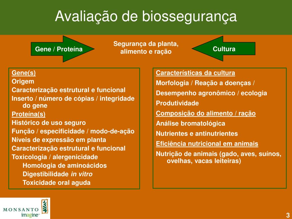 Avaliação de biossegurança Segurança da planta, alimento e ração Cultura Gene / Proteína Gene(s) Origem Caracterização estrutural e funcional Inserto / número de cópias / integridade do gene Proteína(s) Histórico de uso seguro Função / especificidade / modo-de-ação Níveis de expressão em planta Caracterização estrutural e funcional Toxicologia / alergenicidade Homologia de aminoácidos Digestibilidadein vitro Toxicidade oral aguda Características da cultura Morfologia / Reação a doenças / Desempenho agronômico / ecologia Produtividade Composição do alimento / ração Análise bromatológica Nutrientes e antinutrientes Eficiência nutricional em animais Nutrição de animais (gado, aves, suínos, ovelhas, vacas leiteiras)