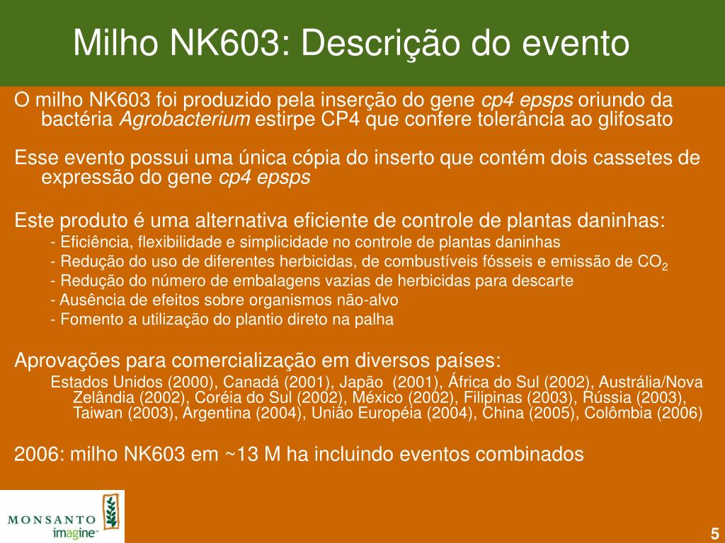 O milho NK603 foi produzido pela inserção do gene cp4 epsps oriundo da bactéria Agrobacterium estirpe CP4 que confere tolerância ao glifosato Esse evento possui uma única cópia do inserto que contém dois cassetes de expressão do gene cp4 epsps Este produto é uma alternativa eficiente de controle de plantas daninhas: - Eficiência, flexibilidade e simplicidade no controle de plantas daninhas - Redução do uso de diferentes herbicidas, de combustíveis fósseis e emissão de CO2 - Redução do número de embalagens vazias de herbicidas para descarte - Ausência de efeitos sobre organismos não-alvo - Fomento a utilização do plantio direto na palha Aprovações para comercialização em diversos países: Estados Unidos (2000), Canadá (2001), Japão (2001), África do Sul (2002), Austrália/Nova Zelândia (2002), Coréia do Sul (2002), México (2002), Filipinas (2003), Rússia (2003), Taiwan (2003), Argentina (2004), União Européia (2004), China (2005), Colômbia (2006) 2006: milho NK603 em ~13 M ha incluindo eventos combinados Milho NK603: Descrição do evento