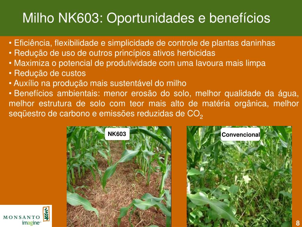 NK603 Convencional Milho NK603: Oportunidades e benefícios • Eficiência, flexibilidade e simplicidade de controle de plantas daninhas • Redução de uso de outros princípios ativos herbicidas • Maximiza o potencial de produtividade com uma lavoura mais limpa • Redução de custos • Auxílio na produção mais sustentável do milho • Benefícios ambientais: menor erosão do solo, melhor qualidade da água, melhor estrutura de solo com teor mais alto de matéria orgânica, melhor seqüestro de carbono e emissões reduzidas de CO2