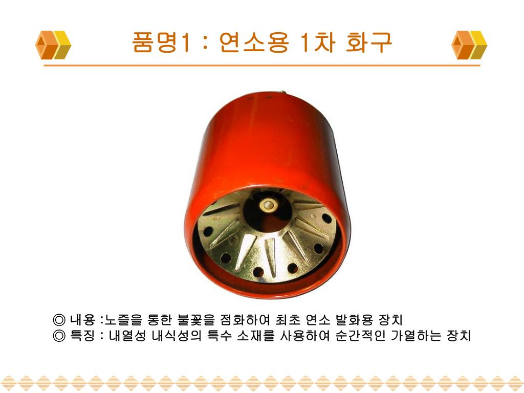 품명2 : 연소용 1,2,3 차 화구 전체 ◎ 내용 2차 확산 장치 - 1차 화염을 안정적인 화염을 유도을 하는 장치 3차 튜브 - 배기가스의 유동에 의한 난류성 흐름을 방지하는 튜브 ◎특징 : 내열성 내식성의 특수 소재를 사용하여 순간적인 가열하는 장치