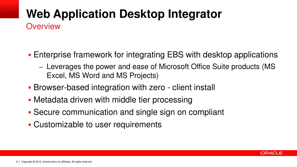 Web Application Desktop Integrator Overview • Enterprise framework for integrating EBS with desktop applications • Leverages the power and ease of Microsoft Office Suite products (MS Excel, MS Word and MS Projects) • Browser-based integration with zero - client install • Metadata driven with middle tier processing • Secure communication and single sign on compliant • Customizable to user requirements