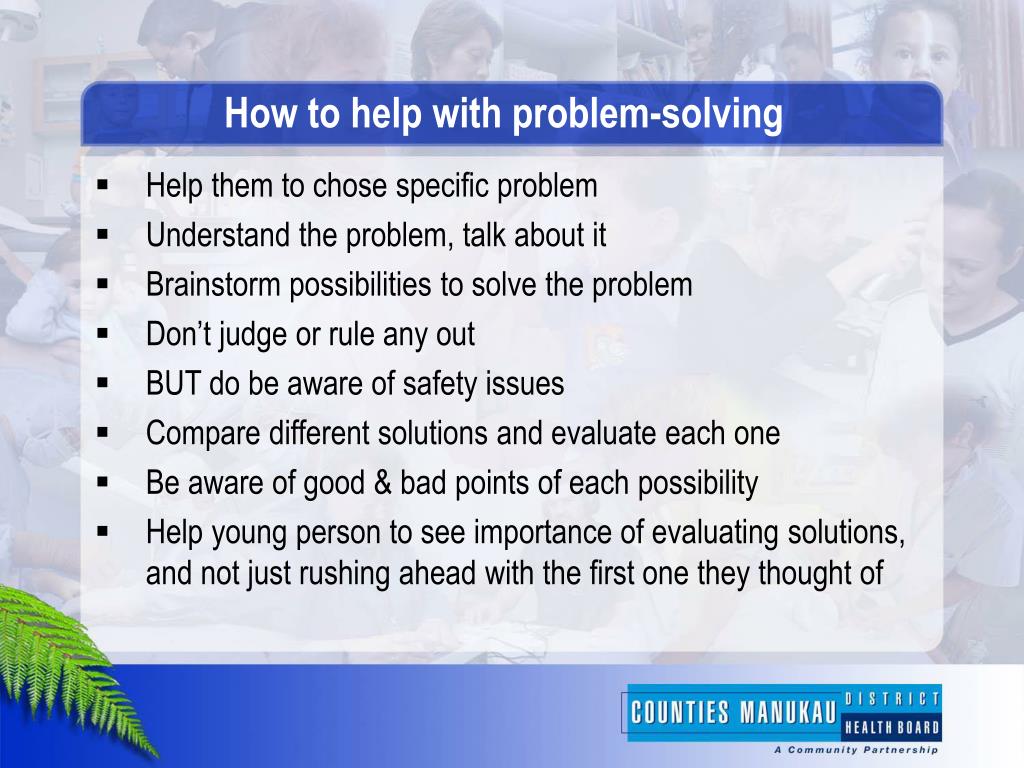 How to help with problem-solving Help them to chose specific problem Understand the problem, talk about it Brainstorm possibilities to solve the problem Don’t judge or rule any out BUT do be aware of safety issues Compare different solutions and evaluate each one Be aware of good & bad points of each possibility Help young person to see importance of evaluating solutions, and not just rushing ahead with the first one they thought of