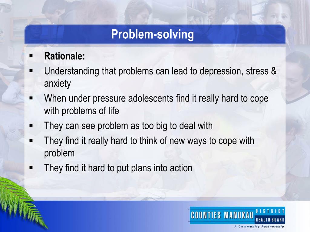 Problem-solving Rationale: Understanding that problems can lead to depression, stress & anxiety When under pressure adolescents find it really hard to cope with problems of life They can see problem as too big to deal with They find it really hard to think of new ways to cope with problem They find it hard to put plans into action