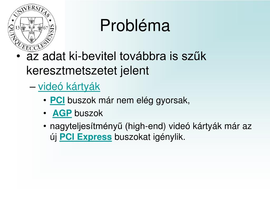 Probléma • az adat ki-bevitel továbbra is szűk keresztmetszetet jelent • videó kártyák • PCI buszok már nem elég gyorsak, • AGP buszok • nagyteljesítményű (high-end) videó kártyák már az új PCI Express buszokat igénylik.