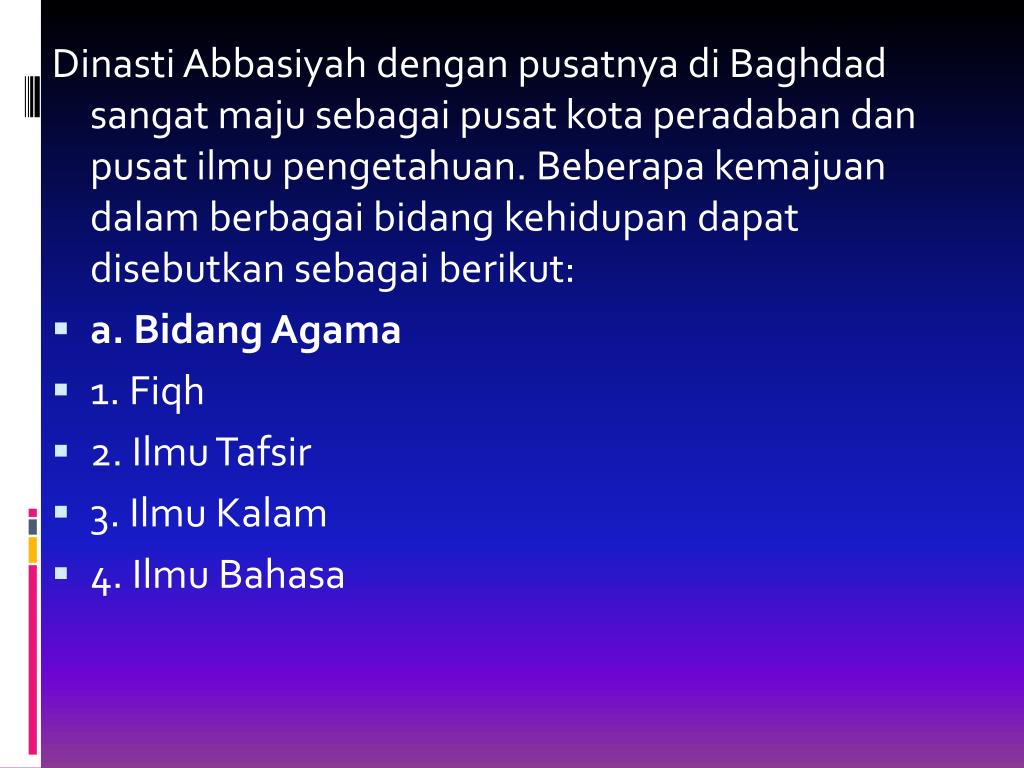 DinastiAbbasiyahdenganpusatnyadi Baghdad sangatmajusebagaipusatkotaperadabandanpusatilmupengetahuan. Beberapakemajuandalamberbagaibidangkehidupandapatdisebutkansebagaiberikut: • a. Bidang Agama • 1. Fiqh • 2. Ilmu Tafsir • 3. Ilmu Kalam • 4. Ilmu Bahasa