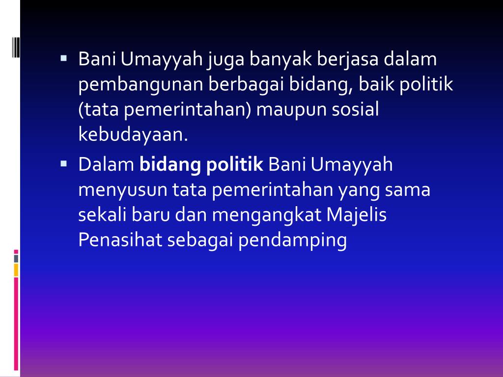Bani Umayyah juga banyak berjasa dalam pembangunan berbagai bidang, baik politik (tata pemerintahan) maupun sosial kebudayaan. • Dalam bidang politik Bani Umayyah menyusun tata pemerintahan yang sama sekali baru dan mengangkat Majelis Penasihat sebagai pendamping