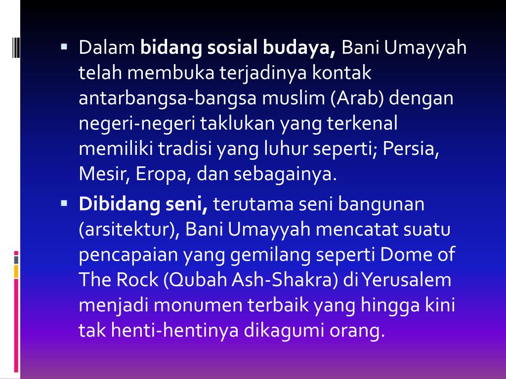 Dalam bidangsosial budaya, Bani Umayyah telah membuka terjadinya kontak antarbangsa-bangsa muslim (Arab) dengan negeri-negeri taklukan yang terkenal memiliki tradisi yang luhur seperti; Persia, Mesir, Eropa, dan sebagainya. • Dibidang seni, terutama seni bangunan (arsitektur), Bani Umayyah mencatat suatu pencapaian yang gemilang seperti Dome of The Rock (Qubah Ash-Shakra) di Yerusalem menjadi monumen terbaik yang hingga kini tak henti-hentinya dikagumi orang.