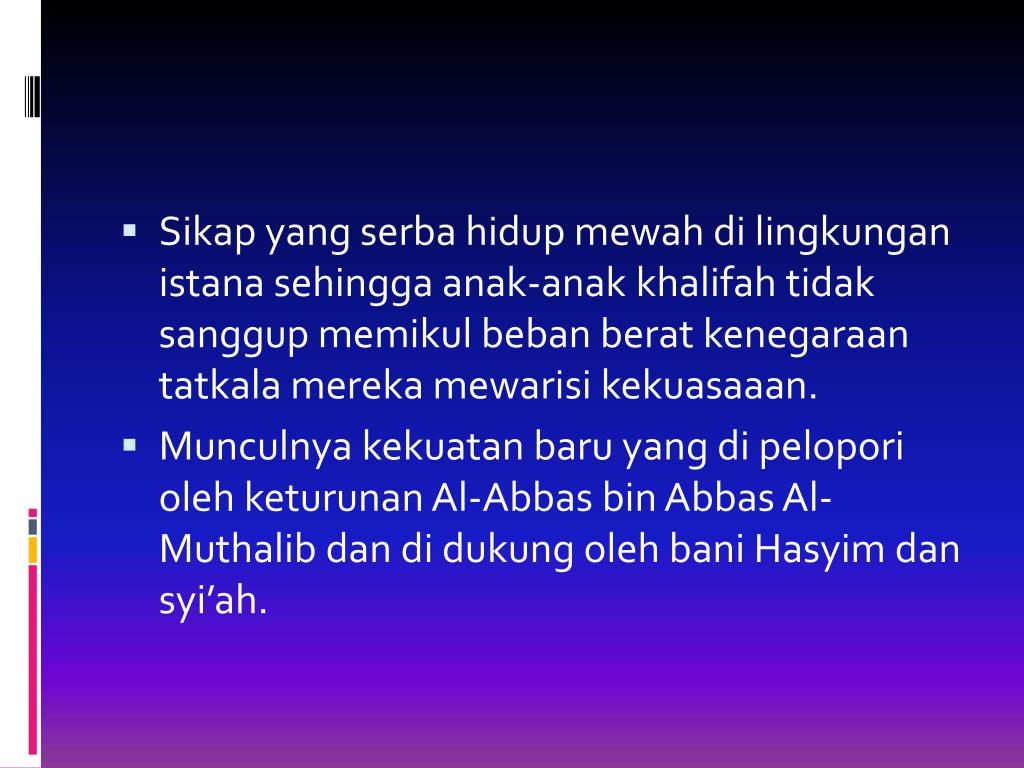 Sikap yang serbahidupmewahdilingkunganistanasehinggaanak-anakkhalifahtidaksanggupmemikulbebanberatkenegaraantatkalamerekamewarisikekuasaaan. • Munculnyakekuatanbaru yang dipeloporiolehketurunan Al-Abbas bin Abbas Al-MuthalibdandidukungolehbaniHasyimdansyi’ah.