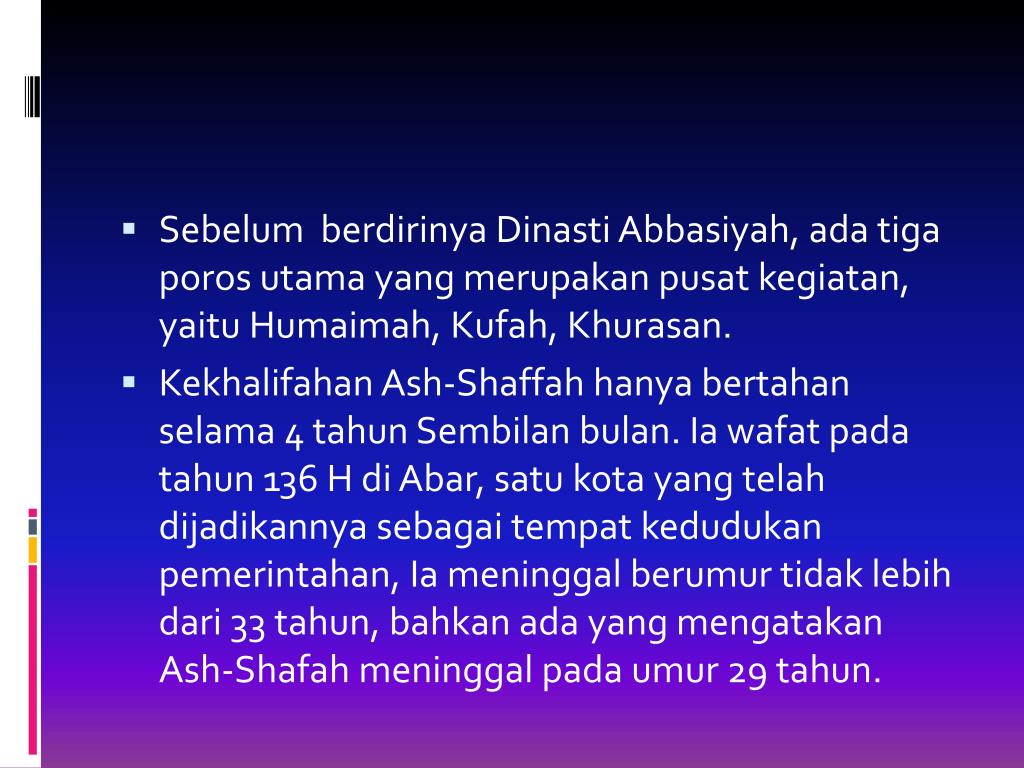 SebelumberdirinyaDinastiAbbasiyah, adatigaporosutama yang merupakanpusatkegiatan, yaituHumaimah, Kufah, Khurasan. • Kekhalifahan Ash-Shaffahhanyabertahanselama 4 tahun Sembilan bulan. Iawafatpadatahun 136 H diAbar, satukota yang telahdijadikannyasebagaitempatkedudukanpemerintahan, Iameninggalberumurtidaklebihdari 33 tahun, bahkanada yang mengatakan Ash-Shafahmeninggalpadaumur 29 tahun.