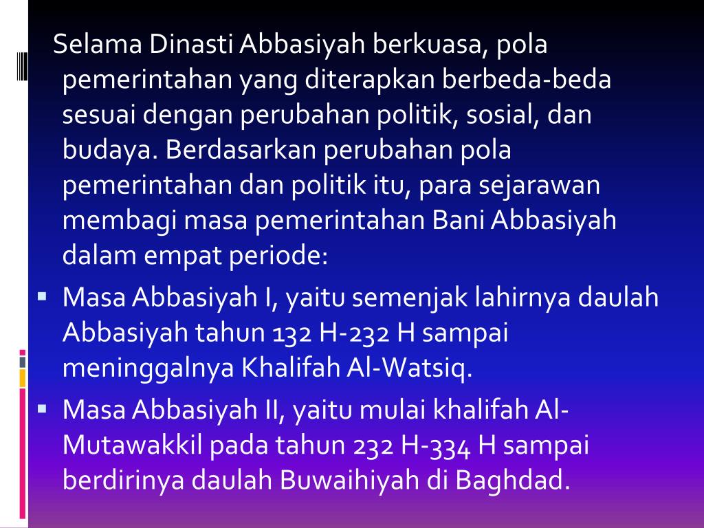 SelamaDinastiAbbasiyahberkuasa, polapemerintahan yang diterapkanberbeda-bedasesuaidenganperubahanpolitik, sosial, danbudaya. Berdasarkanperubahanpolapemerintahandanpolitikitu, parasejarawanmembagimasapemerintahanBaniAbbasiyahdalamempatperiode: • MasaAbbasiyah I, yaitusemenjaklahirnyadaulahAbbasiyahtahun 132 H-232 H sampaimeninggalnyaKhalifah Al-Watsiq. • MasaAbbasiyah II, yaitumulaikhalifah Al-Mutawakkilpadatahun 232 H-334 H sampaiberdirinyadaulahBuwaihiyahdi Baghdad.