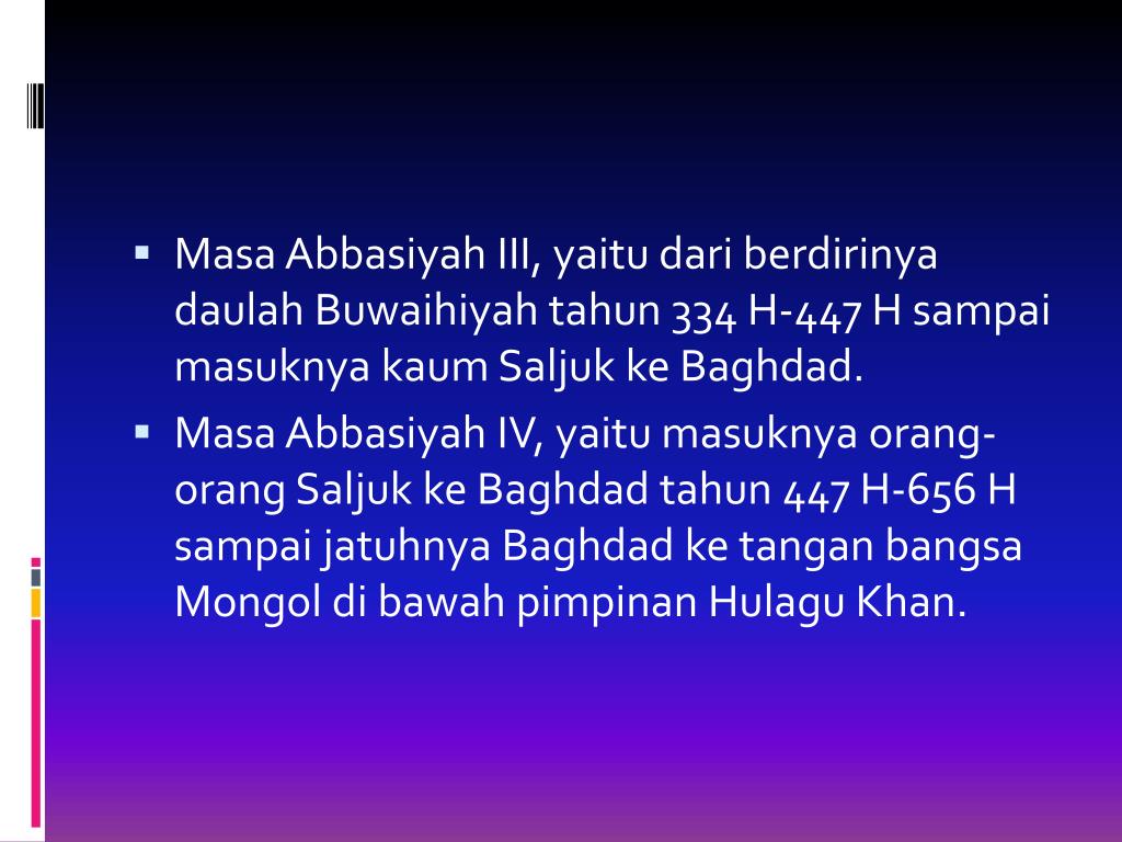 MasaAbbasiyah III, yaitudariberdirinyadaulahBuwaihiyahtahun 334 H-447 H sampaimasuknyakaumSaljukke Baghdad. • MasaAbbasiyah IV, yaitumasuknyaorang-orangSaljukke Baghdad tahun 447 H-656 H sampaijatuhnya Baghdad ketanganbangsa Mongol dibawahpimpinanHulagu Khan.