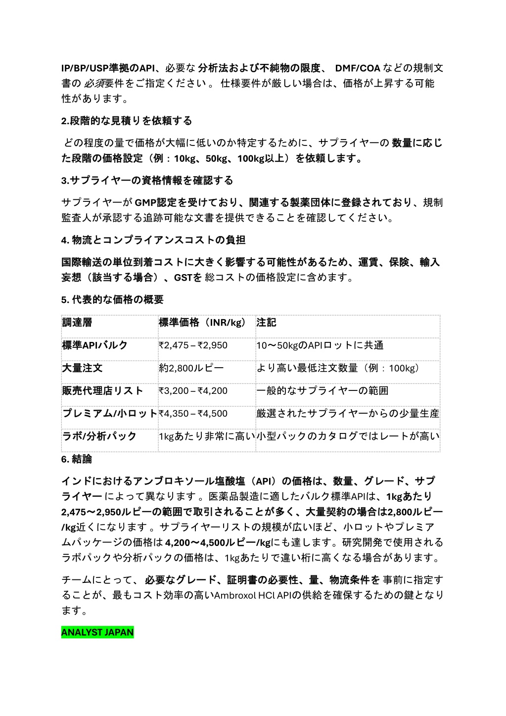 IP/BP/USP準拠 書の必須要件をご指定ください。仕様要件が厳しい場合は、価格が上昇する可能 性があります。 のAPI、必要な分析法 の限度 限度、DMF/COAなどの規制文 準拠の 分析法および および不純物 不純物の 2.段階的 段階的な する な見積 見積りを りを依頼 依頼する どの程度の量で価格が大幅に低いのか特定するために、サプライヤーの数量 た た段階 段階の の価格設定(例: 価格設定(例:10kg、 、50kg、 、100kg以上) 数量に に応 応じ じ を依頼 依頼します。 します。 以上)を 3.サプライヤー サプライヤーの する の資格情報 資格情報を を確認 確認する サプライヤーがGMP認定 監査人が承認する追跡可能な文書を提供できることを確認してください。 認定を を受 受けており、 けており、関連 関連する する製薬団体 製薬団体に に登録 登録されており されており、規制 4. 物流 物流と の負担 負担 とコンプライアンスコスト コンプライアンスコストの 国際輸送 国際輸送の の単位到着 単位到着コスト 場合)、GSTを コストに に大 を総コストの価格設定に含めます。 大きく きく影響 影響する する可能性 可能性があるため、 があるため、運賃、保険、輸入 運賃、保険、輸入 妄想(該当 妄想(該当する する場合)、 5. 代表的 代表的な の概要 概要 な価格 価格の 調達層 調達層 標準価格( 標準価格(INR/kg) )注記 注記 ₹2,475 – ₹2,950 標準 標準APIバルク バルク 10~50kgのAPIロットに共通 大量注文 大量注文 約2,800ルピー より高い最低注文数量(例:100kg) ₹3,200 – ₹4,200 リスト 一般的なサプライヤーの範囲 販売代理店 販売代理店リスト 小ロット ロット₹4,350 – ₹4,500 プレミアム プレミアム/小 厳選されたサプライヤーからの少量生産 ラボ ラボ/分析 分析パック パック 1kgあたり非常に高い小型パックのカタログではレートが高い 6. 結論 結論 塩酸塩(API)の インド インドにおける におけるアンブロキソール アンブロキソール塩酸塩( ライヤーによって異なります。医薬品製造に適したバルク標準APIは、1kgあたり 2,475~ ~2,950ルピー ルピーの の範囲 範囲で で取引 取引されることが されることが多 /kg近くになります。サプライヤーリストの規模が広いほど、小ロットやプレミア ムパッケージの価格は4,200~ ~4,500ルピー ルピー/kgにも達します。研究開発で使用される ラボパックや分析パックの価格は、1kgあたりで違い桁に高くなる場合があります。 )の価格 価格は、 は、数量、 数量、グレード、サプ グレード、サプ ライヤー あたり は2,800ルピー 多く、 く、大量契約 大量契約の の場合 場合は ルピー チームにとって、必要 ることが、最もコスト効率の高いAmbroxol HCl APIの供給を確保するための鍵となり ます。 を事前に指定す 必要な なグレード、 グレード、証明書 証明書の の必要性、量、物流条件 必要性、量、物流条件を ANALYST JAPAN