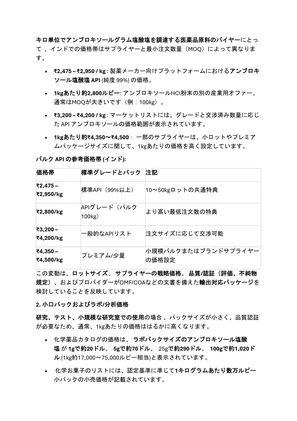 IP/BP/USP準拠 書の必須要件をご指定ください。仕様要件が厳しい場合は、価格が上昇する可能 性があります。 のAPI、必要な分析法 の限度 限度、DMF/COAなどの規制文 準拠の 分析法および および不純物 不純物の 2.段階的 段階的な する な見積 見積りを りを依頼 依頼する どの程度の量で価格が大幅に低いのか特定するために、サプライヤーの数量 た た段階 段階の の価格設定(例: 価格設定(例:10kg、 、50kg、 、100kg以上) 数量に に応 応じ じ を依頼 依頼します。 します。 以上)を 3.サプライヤー サプライヤーの する の資格情報 資格情報を を確認 確認する サプライヤーがGMP認定 監査人が承認する追跡可能な文書を提供できることを確認してください。 認定を を受 受けており、 けており、関連 関連する する製薬団体 製薬団体に に登録 登録されており されており、規制 4. 物流 物流と の負担 負担 とコンプライアンスコスト コンプライアンスコストの 国際輸送 国際輸送の の単位到着 単位到着コスト 場合)、GSTを コストに に大 を総コストの価格設定に含めます。 大きく きく影響 影響する する可能性 可能性があるため、 があるため、運賃、保険、輸入 運賃、保険、輸入 妄想(該当 妄想(該当する する場合)、 5. 代表的 代表的な の概要 概要 な価格 価格の 調達層 調達層 標準価格( 標準価格(INR/kg) )注記 注記 ₹2,475 – ₹2,950 標準 標準APIバルク バルク 10~50kgのAPIロットに共通 大量注文 大量注文 約2,800ルピー より高い最低注文数量(例:100kg) ₹3,200 – ₹4,200 リスト 一般的なサプライヤーの範囲 販売代理店 販売代理店リスト 小ロット ロット₹4,350 – ₹4,500 プレミアム プレミアム/小 厳選されたサプライヤーからの少量生産 ラボ ラボ/分析 分析パック パック 1kgあたり非常に高い小型パックのカタログではレートが高い 6. 結論 結論 塩酸塩(API)の インド インドにおける におけるアンブロキソール アンブロキソール塩酸塩( ライヤーによって異なります。医薬品製造に適したバルク標準APIは、1kgあたり 2,475~ ~2,950ルピー ルピーの の範囲 範囲で で取引 取引されることが されることが多 /kg近くになります。サプライヤーリストの規模が広いほど、小ロットやプレミア ムパッケージの価格は4,200~ ~4,500ルピー ルピー/kgにも達します。研究開発で使用される ラボパックや分析パックの価格は、1kgあたりで違い桁に高くなる場合があります。 )の価格 価格は、 は、数量、 数量、グレード、サプ グレード、サプ ライヤー あたり は2,800ルピー 多く、 く、大量契約 大量契約の の場合 場合は ルピー チームにとって、必要 ることが、最もコスト効率の高いAmbroxol HCl APIの供給を確保するための鍵となり ます。 を事前に指定す 必要な なグレード、 グレード、証明書 証明書の の必要性、量、物流条件 必要性、量、物流条件を ANALYST JAPAN