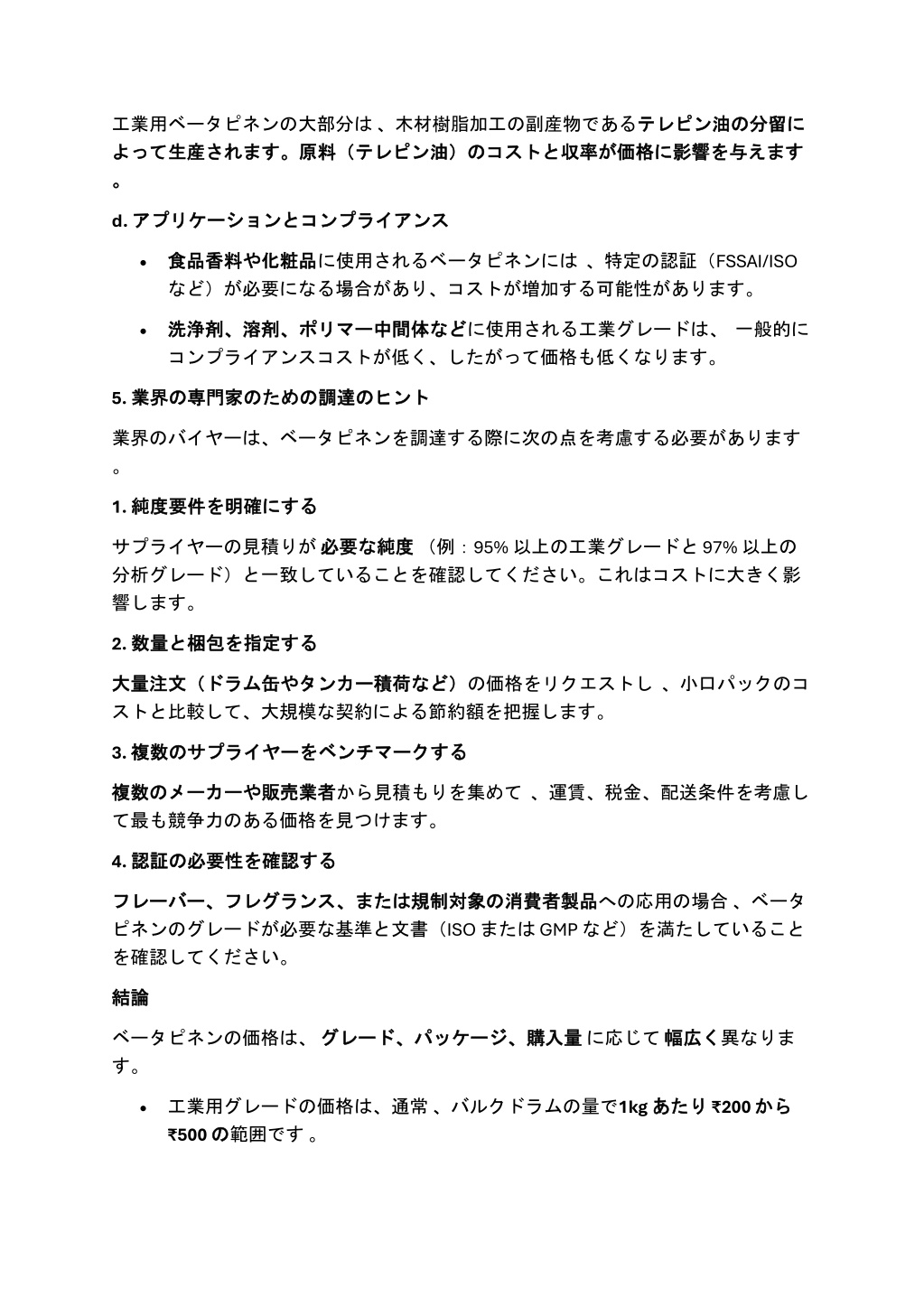 工業用ベータピネンの大部分は、木材樹脂加工の副産物であるテレピン工業用ベータピネンの大部分は、木材樹脂加工の副産物であるテレピン よって よって生産 生産されます。 されます。原料( 原料(テレピン テレピン油) 。 テレピン油 油の の分留 分留に に 油)の のコスト コストと と収率 収率が が価格 価格に に影響 影響を を与 与えます えます 。 d. アプリケーション アプリケーションと とコンプライアンス コンプライアンス や化粧品 化粧品に使用されるベータピネンには、特定の認証(FSSAI/ISO •食品香料 食品香料や など)が必要になる場合があり、コストが増加する可能性があります。 などに使用される工業グレードは、一般的に •洗浄剤、溶剤、 洗浄剤、溶剤、ポリマー コンプライアンスコストが低く、したがって価格も低くなります。 ポリマー中間体 中間体など 5. 業界 業界の のヒント ヒント の専門家 専門家のための のための調達 調達の 業界のバイヤーは、ベータピネンを調達する際に次の点を考慮する必要があります 。 1. 純度要件 純度要件を にする を明確 明確にする サプライヤーの見積りが必要 分析グレード)と一致していることを確認してください。これはコストに大きく影 響します。 な純度 純度(例:95% 以上の工業グレードと 97% 以上の 必要な 2. 数量 数量と する と梱包 梱包を を指定 指定する 積荷など) など)の価格をリクエストし、小口パックのコ 大量注文( 大量注文(ドラム ストと比較して、大規模な契約による節約額を把握します。 ドラム缶 缶や やタンカー タンカー積荷 3. 複数 複数の する のサプライヤー サプライヤーを をベンチマーク ベンチマークする や販売業者 販売業者から見積もりを集めて、運賃、税金、配送条件を考慮し 複数 複数の て最も競争力のある価格を見つけます。 のメーカー メーカーや 4. 認証 認証の する の必要性 必要性を を確認 確認する の消費者製品 消費者製品への応用の場合、ベータ フレーバー、フレグランス、 フレーバー、フレグランス、または ピネンのグレードが必要な基準と文書(ISO または GMP など)を満たしていること を確認してください。 または規制対象 規制対象の 結論 結論 ベータピネンの価格は、グレード、パッケージ、 す。 購入量に応じて幅広 グレード、パッケージ、購入量 幅広く く異なりま •工業用グレードの価格は、通常、バルクドラムの量で1kg あたり ₹500 の の範囲です。 あたり ₹200 から から