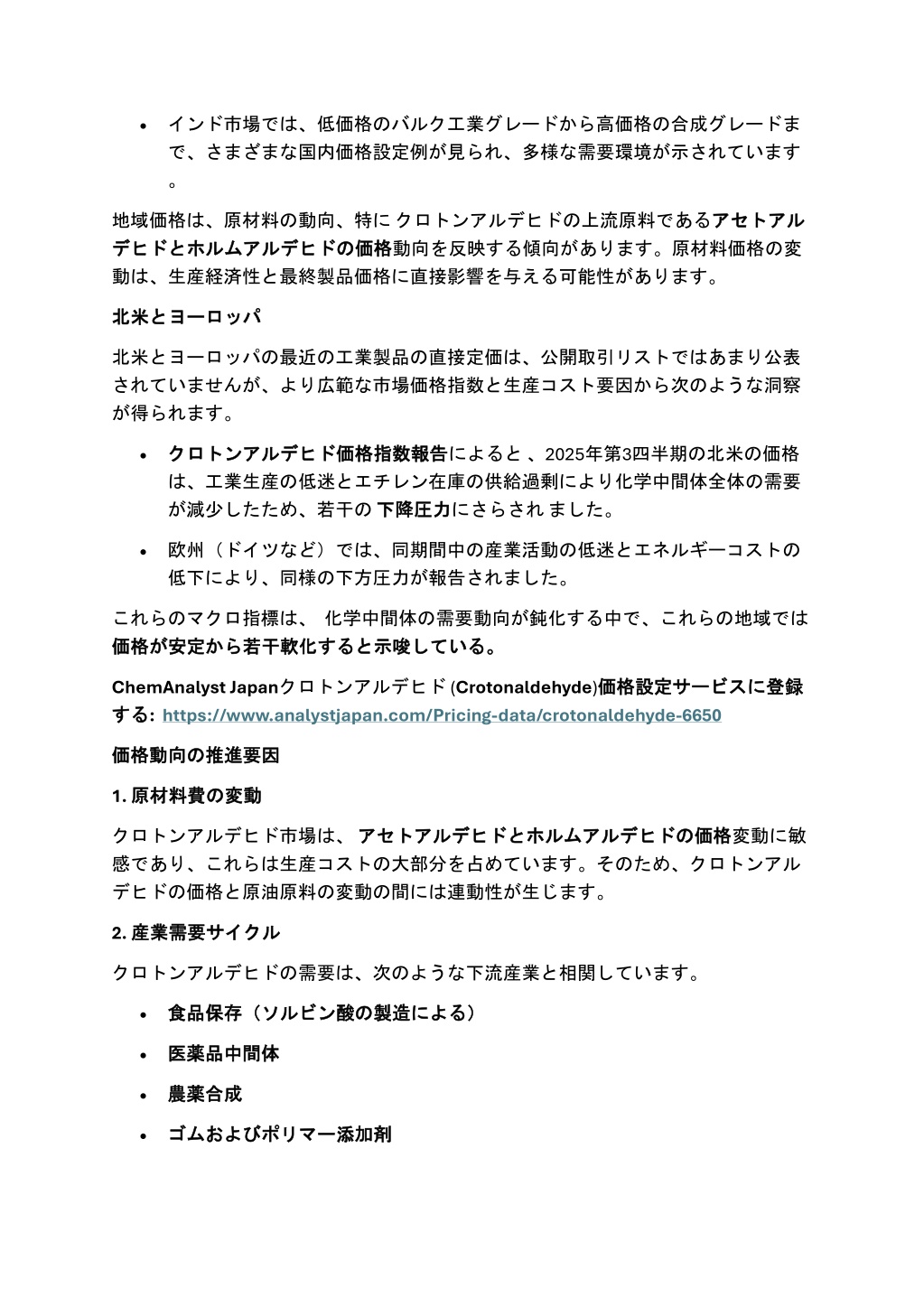 •インド市場では、低価格のバルク工業グレードから高価格の合成グレードま•インド市場では、低価格のバルク工業グレードから高価格の合成グレードま で、さまざまな国内価格設定例が見られ、多様な需要環境が示されています 。 地域価格は、原材料の動向、特にクロトンアルデヒドの上流原料であるアセトアル デヒド デヒドと とホルムアルデヒド ホルムアルデヒドの の価格 価格動向を反映する傾向があります。原材料価格の変 動は、生産経済性と最終製品価格に直接影響を与える可能性があります。 アセトアル とヨーロッパ ヨーロッパ 北米 北米と 北米とヨーロッパの最近の工業製品の直接定価は、公開取引リストではあまり公表 されていませんが、より広範な市場価格指数と生産コスト要因から次のような洞察 が得られます。 価格指数報告によると、2025年第3四半期の北米の価格 •クロトンアルデヒド クロトンアルデヒド価格指数報告 は、工業生産の低迷とエチレン在庫の供給過剰により化学中間体全体の需要 が減少したため、若干の下降圧力 下降圧力にさらされました。 •欧州(ドイツなど)では、同期間中の産業活動の低迷とエネルギーコストの 低下により、同様の下方圧力が報告されました。 これらのマクロ指標は、化学中間体の需要動向が鈍化する中で、これらの地域では 価格 価格が が安定 安定から から若干軟化 若干軟化すると すると示唆 示唆している。 している。 ChemAnalyst Japanクロトンアルデヒド (Crotonaldehyde)価格設定 する する:https://www.analystjapan.com/Pricing-data/crotonaldehyde-6650 価格設定サービス サービスに に登録 登録 の推進要因 推進要因 価格動向 価格動向の 1. 原材料費 原材料費の の変動 変動 クロトンアルデヒド市場は、アセトアルデヒド 感であり、これらは生産コストの大部分を占めています。そのため、クロトンアル デヒドの価格と原油原料の変動の間には連動性が生じます。 アセトアルデヒドと とホルムアルデヒド ホルムアルデヒドの の価格 価格変動に敏 2. 産業需要 産業需要サイクル サイクル クロトンアルデヒドの需要は、次のような下流産業と相関しています。 の製造 製造による) による) •食品保存( 食品保存(ソルビン ソルビン酸 酸の •医薬品中間体 医薬品中間体 •農薬合成 農薬合成 添加剤 •ゴム ゴムおよび およびポリマー ポリマー添加剤