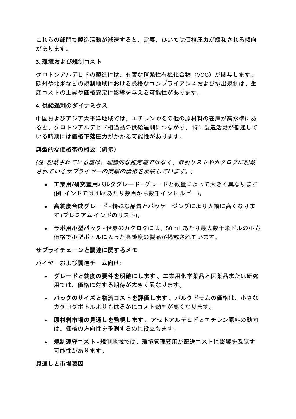 これらの部門で製造活動が減速すると、需要、ひいては価格圧力が緩和される傾向これらの部門で製造活動が減速すると、需要、ひいては価格圧力が緩和される傾向 があります。 3. 環境 環境および 規制コスト コスト および規制 クロトンアルデヒドの製造には、有害な揮発性有機化合物(VOC)が関与します。 欧州や北米などの規制地域における厳格なコンプライアンスおよび排出規制は、生 産コストの上昇や価格安定に影響を与える可能性があります。 4. 供給過剰 供給過剰の のダイナミクス ダイナミクス 中国およびアジア太平洋地域では、エチレンやその他の原材料の在庫が高水準にあ ると、クロトンアルデヒド相当品の供給過剰につながり、特に製造活動が低迷して いる時期には価格下落圧力 価格下落圧力がかかる可能性があります。 の概要(例示) 概要(例示) 典型的 典型的な な価格帯 価格帯の (注: 記載されている値は、理論的な推定値ではなく、取引リストやカタログに記載 されているサプライヤーの実際の価格を反映しています。) •工業用 工業用/研究室用 (例: インドでは 1 kg あたり数百から数千インドルピー)。 研究室用バルクグレード バルクグレード- グレードと数量によって大きく異なります グレード- 特殊な品質とパッケージングにより大幅に高くなりま •高純度合成 高純度合成グレード す (プレミアムインドのリスト)。 パック- 世界のカタログには、50 mL あたり最大数十米ドルの小売 •ラボ ラボ用小型 価格で小型ボトルに入った高純度の製品が掲載されています。 用小型パック メモ サプライチェーン サプライチェーンと と調達 調達に に関 関する するメモ バイヤーおよび調達チーム向け: を明確 明確にします にします。工業用化学薬品と医薬品または研究 •グレード グレードと 用では、価格に対する期待が大きく異なります。 と純度 純度の の要件 要件を します。バルクドラムの価格は、小さな •パック パックの カタログボトルよりもはるかにコスト効率が高くなります。 のサイズ サイズと と物流 物流コスト コストを を評価 評価します します。アセトアルデヒドとエチレン原料の動向 •原材料市場 原材料市場の は、価格の方向性を予測するのに役立ちます。 の見通 見通しを しを監視 監視します コスト- 規制地域では、環境管理費用が配送コストに影響を及ぼす •規制遵守 規制遵守コスト 可能性があります。 市場要因 見通 見通しと しと市場要因
