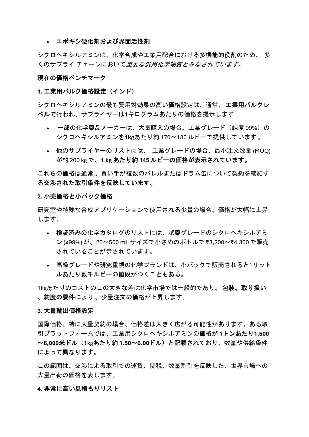 シクロヘキシルアミン(Cyclohexylamine)の価格:市シクロヘキシルアミン(Cyclohexylamine)の価格:市 場概要、コスト要因、調達に関する洞察 シクロヘキシルアミン(Cyclohexylamine)(CAS 108-91-8)は、化学合成、腐食防 止剤 止剤、ゴム ゴム薬品 薬品、農薬、水処理、特殊化学品製造 農薬、水処理、特殊化学品製造における れている れている多用途 多用途の の有機アミンです。価格はグレード、 きく異なるため、業界の専門家は現在の市場価格と価格動向を常に把握しておくこ とが不可欠です 腐食防 における中間体 中間体として として広 広く く使用 使用さ さ グレード、純度、数量、用途 純度、数量、用途によって大 この この記事 記事では、 では、シクロヘキシルアミン シクロヘキシルアミンの の価格 価格、インドおよび国際的な状況での一般 的なコストの範囲、および価格に影響を与える主な要因について明確な概要を示し ます。 とは? シクロヘキシルアミン シクロヘキシルアミンとは? シクロヘキシルアミン(化学式C₆H₁₃N)は、強いアンモニア臭を持つ無色から黄色 の液体です。以下の合成における構成要素として使用されます •医薬品化合物 医薬品化合物 および加硫促進剤 加硫促進剤 •ゴム ゴム添加剤 添加剤および および農薬中間体 農薬中間体 •除草剤 除草剤および の腐食防止剤 腐食防止剤 •蒸気 蒸気パイプライン パイプラインおよび および工業用水 工業用水システム システム用 用の