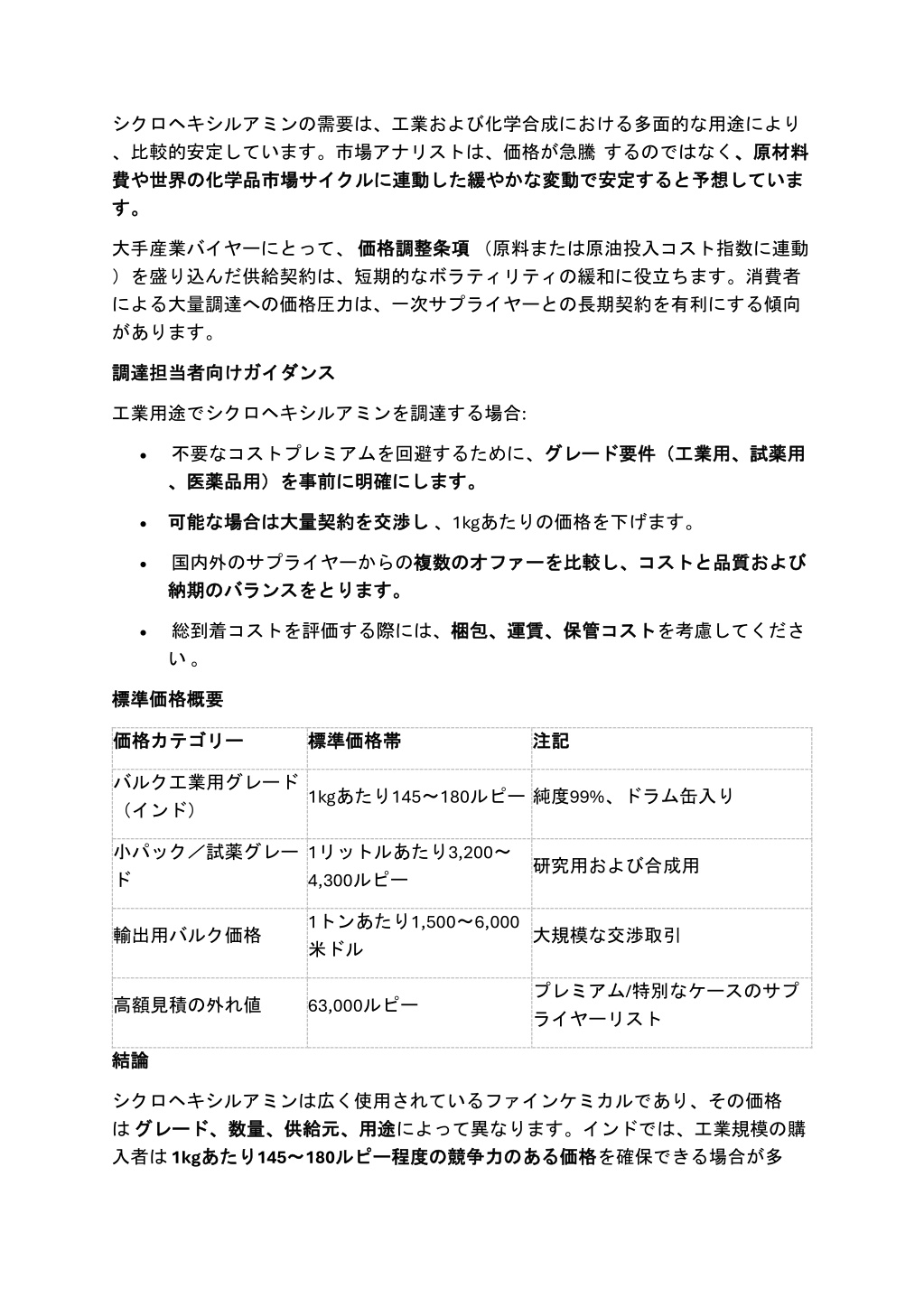 シクロヘキシルアミンの需要は、工業および化学合成における多面的な用途によりシクロヘキシルアミンの需要は、工業および化学合成における多面的な用途により 、比較的安定しています。市場アナリストは、価格が急騰するのではなく、 費 費や や世界 世界の の化学品市場 化学品市場サイクル サイクルに に連動 連動した した緩 す。 、原材料 原材料 緩やかな やかな変動 変動で で安定 安定すると すると予想 予想していま していま す。 大手産業バイヤーにとって、価格調整条項 )を盛り込んだ供給契約は、短期的なボラティリティの緩和に役立ちます。消費者 価格調整条項(原料または原油投入コスト指数に連動 による大量調達への価格圧力は、一次サプライヤーとの長期契約を有利にする傾向 があります。 けガイダンス ガイダンス 調達担当者向 調達担当者向け 工業用途でシクロヘキシルアミンを調達する場合: •不要なコストプレミアムを回避するために、グレード 、医薬品用) 、医薬品用)を を事前 事前に に明確 明確にします。 グレード要件(工業用、試薬用 要件(工業用、試薬用 にします。 し、1kgあたりの価格を下げます。 •可能 可能な な場合 場合は は大量契約 大量契約を を交渉 交渉し •国内外のサプライヤーからの複数 納期 納期の のバランス バランスをとります。 複数の のオファー オファーを を比較 比較し、 し、コスト コストと と品質 品質および および をとります。 •総到着コストを評価する際には、梱包、運賃、保管 い。 梱包、運賃、保管コスト コストを考慮してくださ 標準価格概要 標準価格概要 価格 価格カテゴリー カテゴリー 標準価格帯 標準価格帯 注記 注記 バルク工業用グレード (インド) 1kgあたり145~180ルピー純度99%、ドラム缶入り 1リットルあたり3,200~ 4,300ルピー 小パック/試薬グレー ド 研究用および合成用 1トンあたり1,500~6,000 米ドル 輸出用バルク価格 大規模な交渉取引 プレミアム/特別なケースのサプ ライヤーリスト 高額見積の外れ値 63,000ルピー 結論 結論 シクロヘキシルアミンは広く使用されているファインケミカルであり、その価格 はグレード、 グレード、数量、供給元、用途 数量、供給元、用途によって異なります。インドでは、工業規模の購 入者は1kgあたり あたり145~ ~180ルピー ルピー程度 程度の の競争力 競争力のある のある価格 価格を確保できる場合が多
