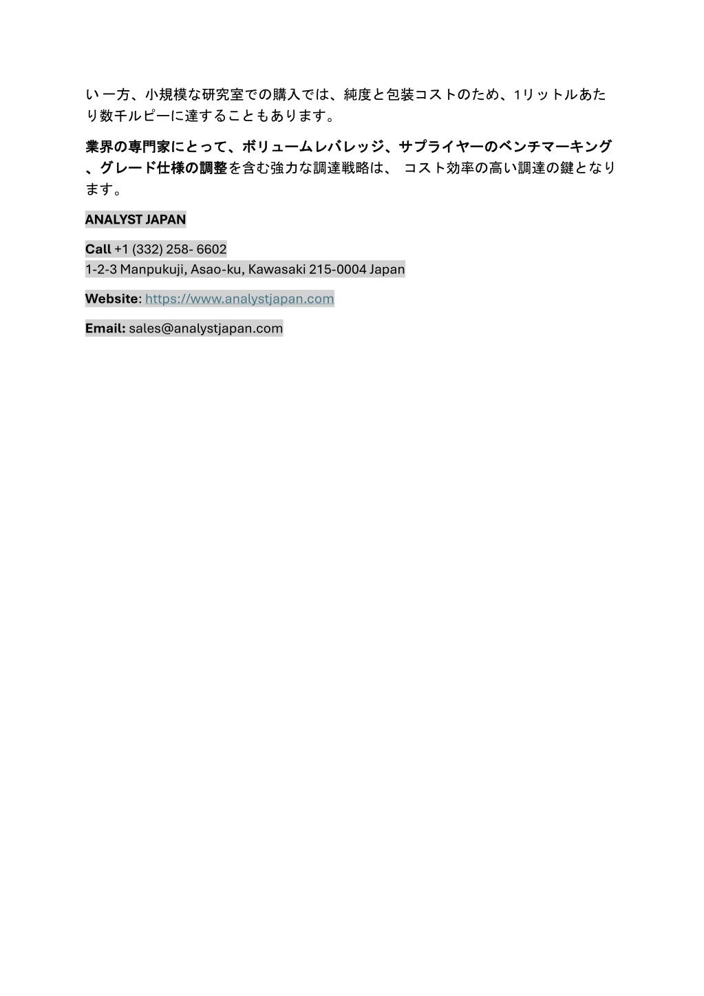 い一方、小規模な研究室での購入では、純度と包装コストのため、1リットルあたい一方、小規模な研究室での購入では、純度と包装コストのため、1リットルあた り数千ルピーに達することもあります。 業界 業界の の専門家 専門家にとって、 にとって、ボリュームレバレッジ、サプライヤー ボリュームレバレッジ、サプライヤーの 調整を含む強力な調達戦略は、コスト効率の高い調達の鍵となり ます。 のベンチマーキング ベンチマーキング 、グレード 、グレード仕様 仕様の の調整 ANALYST JAPAN Call+1 (332) 258- 6602 1-2-3 Manpukuji, Asao-ku, Kawasaki 215-0004 Japan Website:https://www.analystjapan.com Email:sales@analystjapan.com
