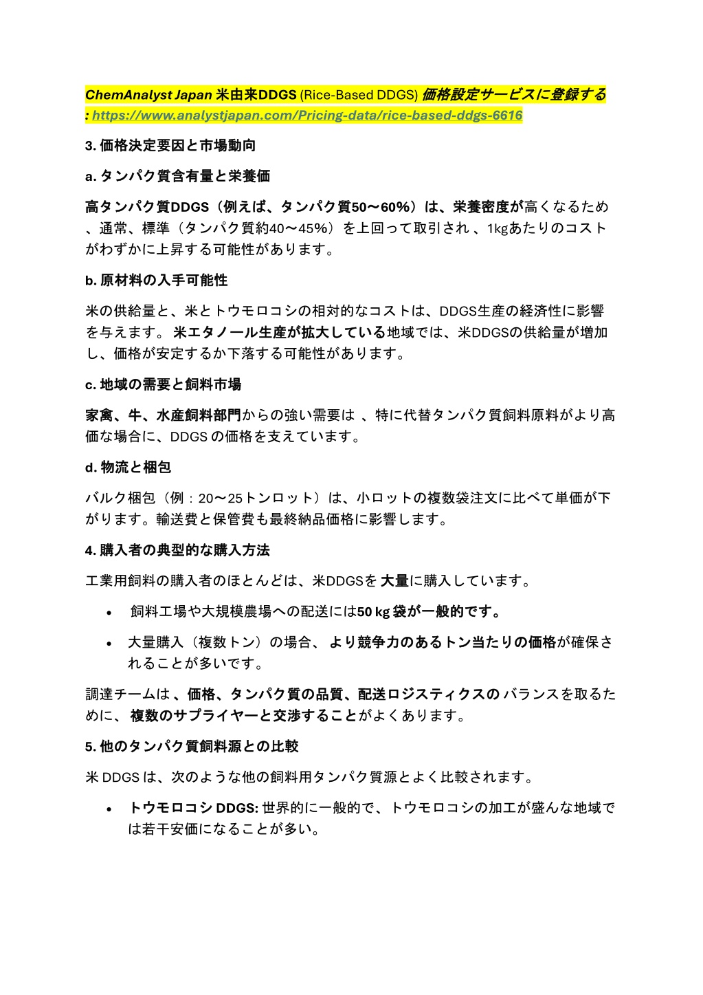 ChemAnalyst Japan米由来 :https://www.analystjapan.com/Pricing-data/rice-based-ddgs-6616 米由来DDGS(Rice-Based DDGS)価格設定 価格設定サービス サービスに に登録 登録する する 3. 価格決定要因 価格決定要因と と市場動向 市場動向 a. タンパク タンパク質含有量 と栄養価 栄養価 質含有量と 質DDGS(例 質50~ ~60%)は、 %)は、栄養密度 高 高タンパク タンパク質 、通常、標準(タンパク質約40~45%)を上回って取引され、1kgあたりのコスト がわずかに上昇する可能性があります。 (例えば、 えば、タンパク タンパク質 栄養密度が が高くなるため b. 原材料 原材料の の入手可能性 入手可能性 米の供給量と、米とトウモロコシの相対的なコストは、DDGS生産の経済性に影響 を与えます。米 米エタノール エタノール生産 生産が が拡大 拡大している している地域では、米DDGSの供給量が増加 し、価格が安定するか下落する可能性があります。 c. 地域 地域の と飼料市場 飼料市場 の需要 需要と 家禽、牛、水産飼料部門 家禽、牛、水産飼料部門からの強い需要は、特に代替タンパク質飼料原料がより高 価な場合に、DDGS の価格を支えています。 d. 物流 物流と と梱包 梱包 バルク梱包(例:20~25トンロット)は、小ロットの複数袋注文に比べて単価が下 がります。輸送費と保管費も最終納品価格に影響します。 4. 購入者 購入者の な購入方法 購入方法 の典型的 典型的な 工業用飼料の購入者のほとんどは、米DDGSを大量 大量に購入しています。 •飼料工場や大規模農場への配送には50 kg 袋 です。 袋が が一般的 一般的です。 •大量購入(複数トン)の場合、より れることが多いです。 より競争力 競争力のある のあるトン トン当 当たりの たりの価格 価格が確保さ 調達チームは、価格、 めに、複数 複数の のバランスを取るた 、価格、タンパク タンパク質 質の の品質、配送 品質、配送ロジスティクス ロジスティクスの することがよくあります。 のサプライヤー サプライヤーと と交渉 交渉すること 5. 他 比較 他の のタンパク タンパク質飼料源 質飼料源との との比較 米 DDGS は、次のような他の飼料用タンパク質源とよく比較されます。 •トウモロコシ トウモロコシ DDGS:世界的に一般的で、トウモロコシの加工が盛んな地域で は若干安価になることが多い。