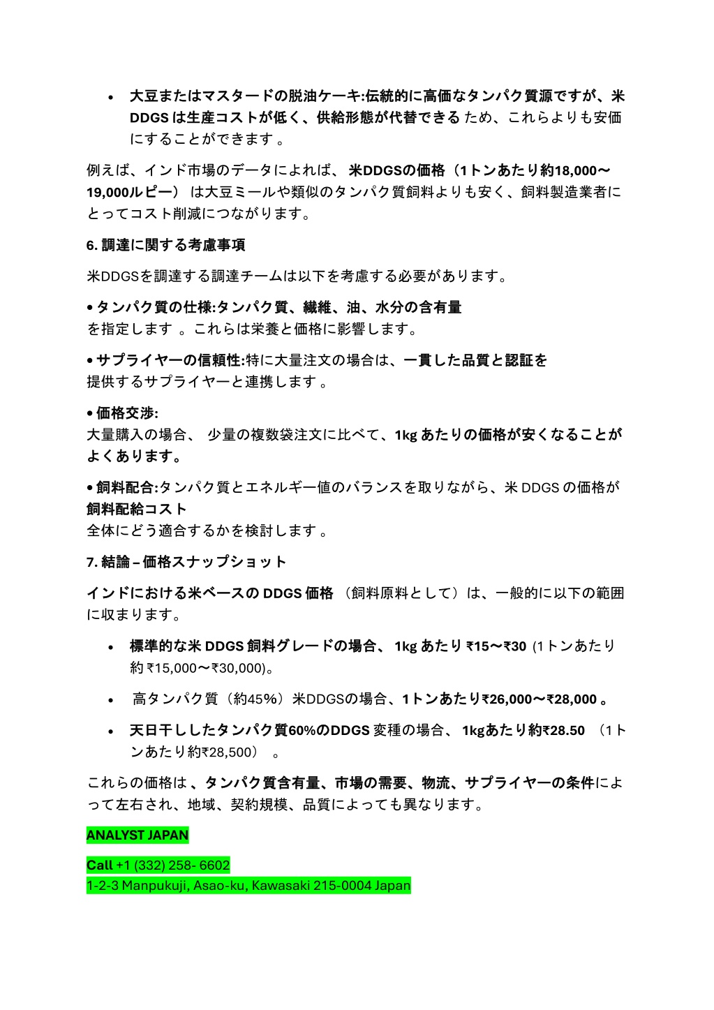 ケーキ:伝統的 く、供給形態 供給形態が 米 •大豆 大豆または DDGS は にすることができます。 またはマスタード マスタードの の脱油 脱油ケーキ 伝統的に に高価 高価な できるため、これらよりも安価 なタンパク タンパク質源 質源ですが、 ですが、米 は生産 生産コスト コストが が低 低く、 が代替 代替できる 例えば、インド市場のデータによれば、米 19,000ルピー) ルピー)は大豆ミールや類似のタンパク質飼料よりも安く、飼料製造業者に とってコスト削減につながります。 米DDGSの の価格( 価格(1トン 約18,000~ トンあたり あたり約 ~ 6. 調達 調達に 関する する考慮事項 考慮事項 に関 米DDGSを調達する調達チームは以下を考慮する必要があります。 • タンパク タンパク質 を指定します。これらは栄養と価格に影響します。 の仕様 仕様:タンパク タンパク質、繊維、油、水分 質、繊維、油、水分の の含有量 含有量 質の • サプライヤー サプライヤーの 提供するサプライヤーと連携します。 の信頼性 信頼性:特に大量注文の場合は、一貫 を 一貫した した品質 品質と と認証 認証を • 価格交渉 価格交渉: 大量購入の場合、少量の複数袋注文に比べて、1kg あたりの よくあります。 よくあります。 あたりの価格 価格が が安 安くなることが くなることが • 飼料配合 飼料配合:タンパク質とエネルギー値のバランスを取りながら、米 DDGS の価格が 飼料配給 飼料配給コスト コスト 全体にどう適合するかを検討します。 7. 結論 結論 – 価格 価格スナップショット スナップショット の DDGS 価格 価格(飼料原料として)は、一般的に以下の範囲 インド インドにおける における米 に収まります。 米ベース ベースの 米 DDGS 飼料 の場合、 場合、 1kg あたり あたり ₹15~ ~₹30(1トンあたり •標準的 標準的な 約 ₹15,000~₹30,000)。 な米 飼料グレード グレードの •高タンパク質(約45%)米DDGSの場合、1トン トンあたり あたり₹26,000~ ~₹28,000 。 。 質60%の のDDGS変種の場合、1kgあたり 約₹28.50(1ト •天日干 天日干しした ンあたり約₹28,500)。 ししたタンパク タンパク質 あたり約 これらの価格は、タンパク って左右され、地域、契約規模、品質によっても異なります。 、タンパク質含有量、市場 質含有量、市場の の需要、物流、 需要、物流、サプライヤー サプライヤーの の条件 条件によ ANALYST JAPAN Call+1 (332) 258- 6602 1-2-3 Manpukuji, Asao-ku, Kawasaki 215-0004 Japan