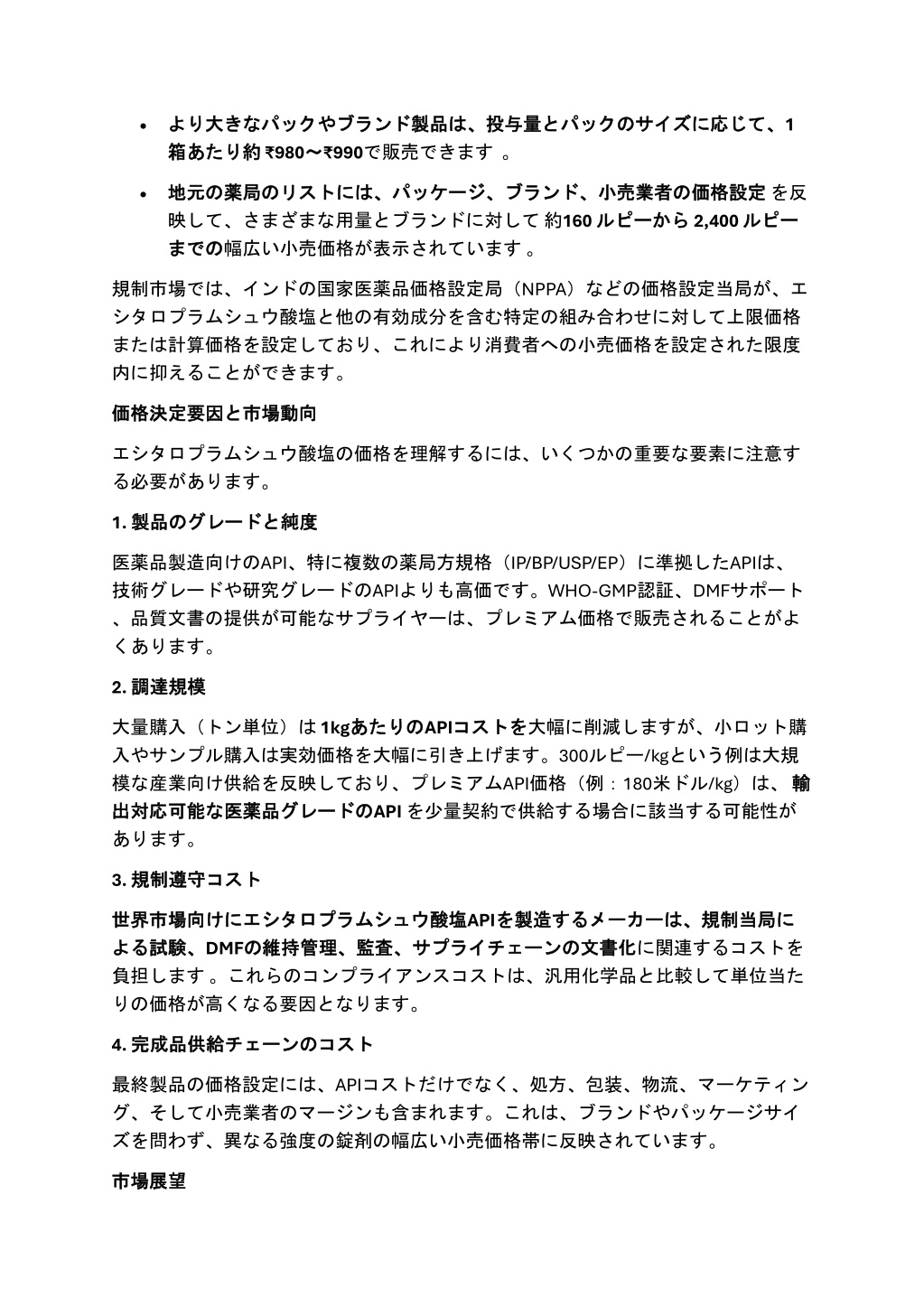 応じて、 じて、1 •より より大 箱 箱あたり あたり約 大きな きなパック 約 ₹980~ パックや やブランド ブランド製品 ~₹990で販売できます。 製品は、 は、投与量 投与量と とパック パックの のサイズ サイズに に応 の価格設定 価格設定を反 から 2,400 ルピー •地元 地元の 映して、さまざまな用量とブランドに対して約160 ルピー までの までの幅広い小売価格が表示されています。 の薬局 薬局の のリスト リストには、 には、パッケージ、ブランド、 パッケージ、ブランド、小売業者 小売業者の ルピーから ルピー 規制市場では、インドの国家医薬品価格設定局(NPPA)などの価格設定当局が、エ シタロプラムシュウ酸塩と他の有効成分を含む特定の組み合わせに対して上限価格 または計算価格を設定しており、これにより消費者への小売価格を設定された限度 内に抑えることができます。 と市場動向 市場動向 価格決定要因 価格決定要因と エシタロプラムシュウ酸塩の価格を理解するには、いくつかの重要な要素に注意す る必要があります。 1. 製品 製品の と純度 純度 のグレード グレードと 医薬品製造向けのAPI、特に複数の薬局方規格(IP/BP/USP/EP)に準拠したAPIは、 技術グレードや研究グレードのAPIよりも高価です。WHO-GMP認証、DMFサポート 、品質文書の提供が可能なサプライヤーは、プレミアム価格で販売されることがよ くあります。 2. 調達規模 調達規模 大量購入(トン単位)は1kgあたりの 入やサンプル購入は実効価格を大幅に引き上げます。300ルピー/kgという例は大規 模な産業向け供給を反映しており、プレミアムAPI価格(例:180米ドル/kg)は、輸 出対応可能 出対応可能な な医薬品 医薬品グレード グレードの のAPIを少量契約で供給する場合に該当する可能性が あります。 あたりのAPIコスト コストを を大幅に削減しますが、小ロット購 輸 3. 規制遵守 規制遵守コスト コスト 酸塩APIを サプライチェーンの 世界市場向 世界市場向けに 試験、DMFの 負担します。これらのコンプライアンスコストは、汎用化学品と比較して単位当た りの価格が高くなる要因となります。 けにエシタロプラムシュウ エシタロプラムシュウ酸塩 を製造 製造する するメーカー メーカーは、 は、規制当局 規制当局に に よる よる試験、 の維持管理、監査、 維持管理、監査、サプライチェーン の文書化 文書化に関連するコストを 4. 完成品供給 完成品供給チェーン のコスト コスト チェーンの 最終製品の価格設定には、APIコストだけでなく、処方、包装、物流、マーケティン グ、そして小売業者のマージンも含まれます。これは、ブランドやパッケージサイ ズを問わず、異なる強度の錠剤の幅広い小売価格帯に反映されています。 市場展望 市場展望